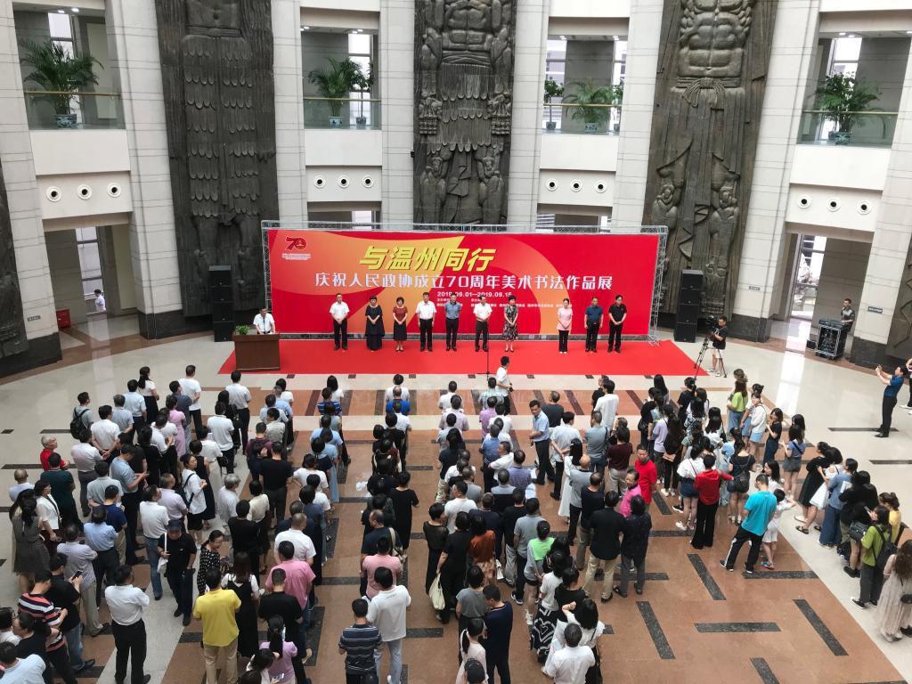 昨天,天朗气清,惠风和畅,美院17美术师范1班、18美术师范1、2、3共4个班级学生在蔡可群老师、陈伟老师、黄良老师的带领下,于上午9时乘校车到市府路温州博物馆参观了“与温州同行——庆祝人民政协成立70周年美术书法作品展”。