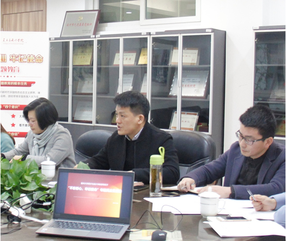 校党委委员、宣传部长潘玉驹作指导讲话。他对美院新一届领导班子组建以来的工作实绩给予高度评价,不仅年轻且有活力,还能讲规矩且敢担当,做到干事而能成事。他指出,美术学院班子民主生活会在班子的高度重视下准备充分,批评与自我批评开展地直率、诚恳,意见建议能切中要害,以小见大,见事见人,其整改措施积极有效。针对美院的办学定位和未来发展,潘部长提出三点建议:第一,办学更精准,希望美术学院在学校“三大目标”的框架下实现精准定位,在做好基础性工作的基础上挖掘办学亮点;第二,干事更豪迈,既要分工明确,又要团结协作,还要胆大心细;第三,合力再凝聚,促成班子的合力、教师的合力、工作的合力;第四,底线要守牢,真正将“不忘初心、牢记使命”落到实处。