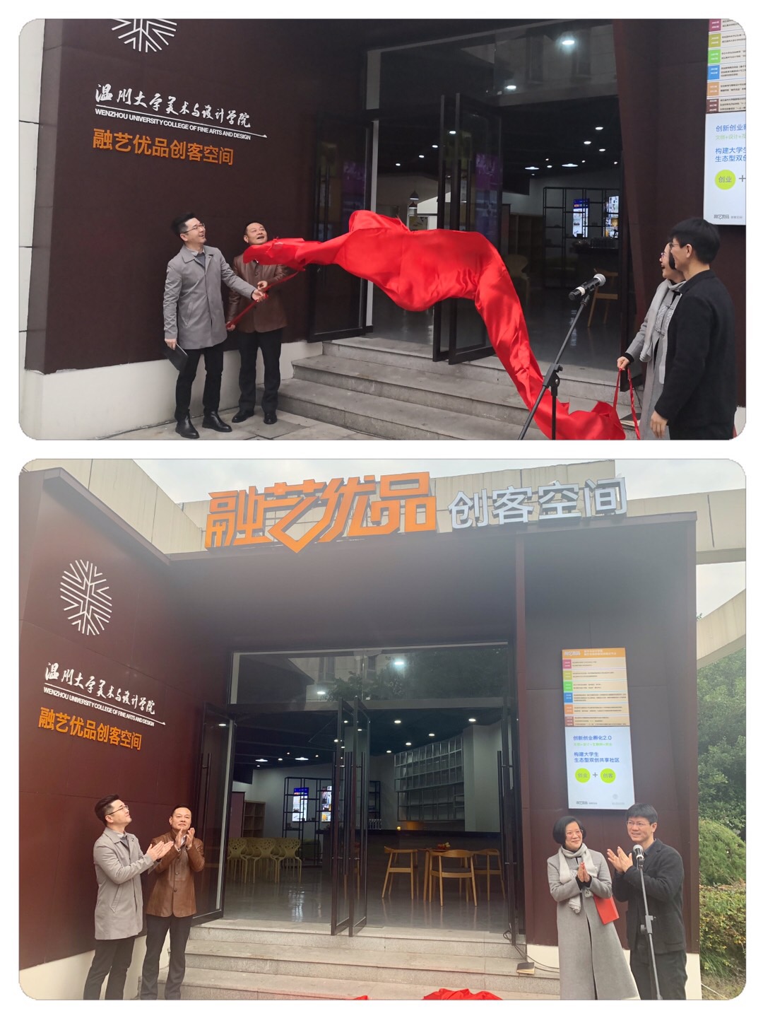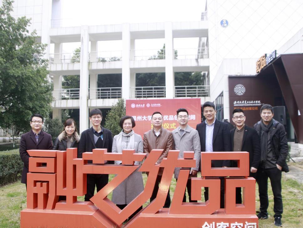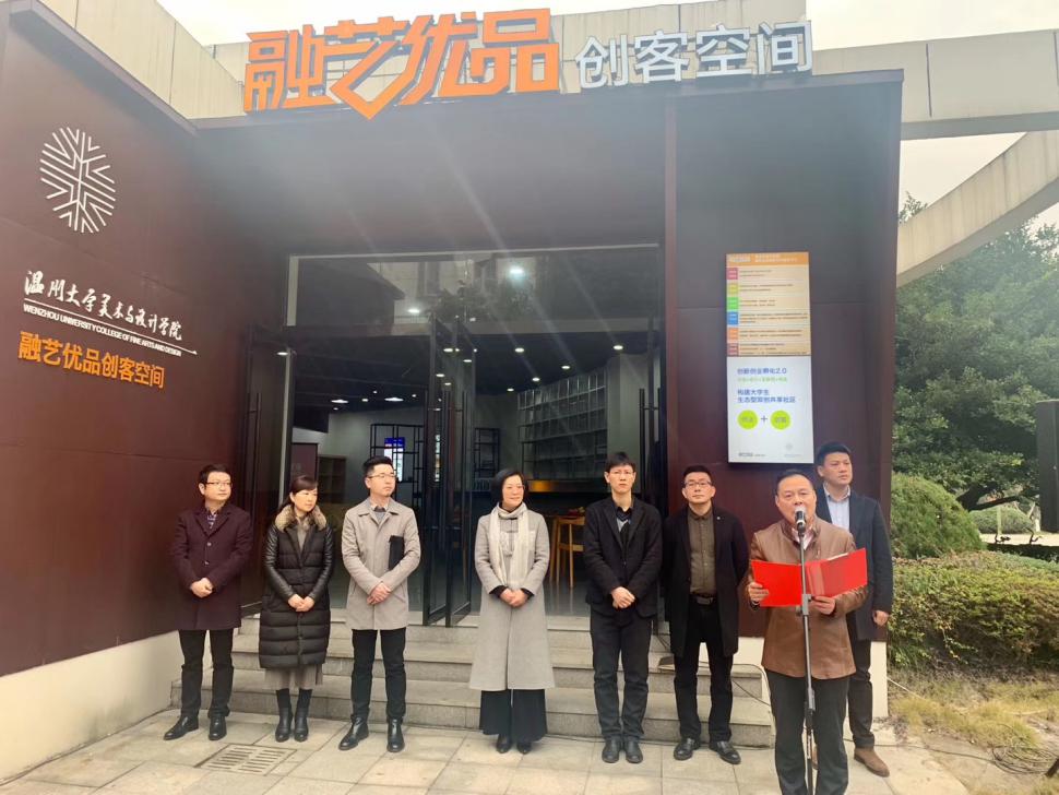 2020年1月3日上午,beat365英国官方网站“融艺优品”创客空间揭牌仪式隆重举行。beat365英国官方网站党委委员、宣传部部长潘玉驹、创新创业学院院长施永川,温州四目公司总经理张登峰、beat365英国官方网站院长谢子静、党委书记叶正飞等院领导班子及入驻团队师生出席了揭牌仪式。