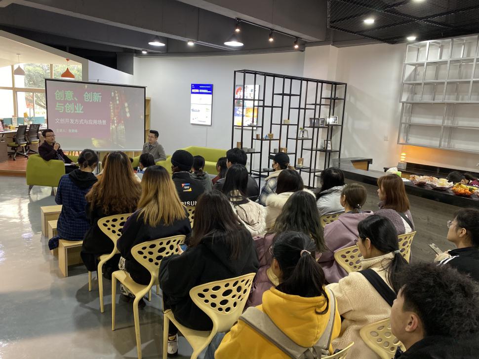 “融艺优品”创客空间第一场创客沙龙也在当天隆重开讲,学院邀请了温州四目联合文化传播有限公司张登峰总经理为beat365官网创客空间团队作《创意、创新与创业》讲座。张登峰总经理分享了融合创新思维的概念,希望创业的团队能在创新创业创意与营销领域,拓展新的领域,寻找新的价值网,入驻的创业团队也分享了他们的创业经历。交换相互的创业经验。