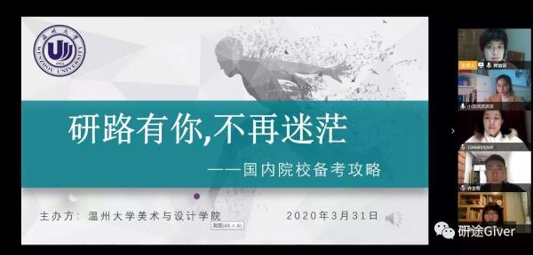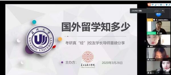 疫情不是暂停键,成长指导全在线。一个多月时间以来虽然“开学不返校”,但是245名本科毕业生的就业工作一直让beat365英国官方网站的老师们牵挂不已,尤其是对于学院立志考研和准备出国的学生,如何帮助他们顺利实现梦想?为了更好地指导学生学习规划和考研升学,近日,beat365英国官方网站在“云端”组建了一个实力不容小觑的导师团,聘请8位优秀校友担任“考研(留学)校友学长导师”,并且连续举办了2场“云”端传送考研(留学)真“经”的活动,参加学生近200人次。 “我最大的感受是如果准备出国留学,语言沟通能力是很重要的,这方面要付出较多的精力,另外就是要确定好自己的目标,选择哪个国家的哪所大学以及学什么专业,目标确定了以后才能走得更快更远!”目前正留学意大利罗马第一大学的陶夏欣学姐这么说。 “选择考研一定要走出自己的舒适圈,你可以去图书馆、去学校考研教室,尽可能不要呆在寝室里;如果你够自律,你可以一个人学习,如果你觉得自己不够自律,最好选择一个考研的小伙伴一起努力。”在浙江理工大学读研的学长许金智这样鼓励学弟学妹。 在学院精心安排的 “国外留学知多少”留学专场交流会和“国内院校备考攻略”国内考研专场交流会上,八名导师精心准备、重磅分享自己的申请出国读研和国内考研的宝贵经验和心得,也收获了学弟学妹的诸多点赞。受聘为“留学校友学长导师”的三位校友,分别是留学意大利罗马第一大学的陶夏欣、留学韩国梨花女子大学的费婕和留学澳洲昆士兰大学的杨凡,在当前疫情严峻的留学境况下,她们克服距离和时差上的影响,精心准备,从留学生活、留学优势、留学申请经验和注意事项等方面为同学们提供了有益的经验,他们也分别担任温大美院学子在欧洲、韩国、澳洲的留学校友学长导师,为日后有留学意向的同学提供更多的渠道和联络指导帮助。 五位来自杭州师范大学、浙江理工大学、beat365英国官方网站的校友学长导师,则从备考规划、择校攻略、复试和调剂等多方面为意向考研或正在准备复试调剂同学在云端奉送了宝贵的实战经验。浙理工校友杨怡洁还在线上赠送了自己珍贵的考研资料,并展示了自己复试时做的“研究生个人规划”;浙理工许金智、杭师大金佳吉两位校友从专业绘画作品集的积累方面给考研和复试同学支招;2位来自本校的研究生陈嘉怡、曾箫笛为同学们传授了“调剂攻略”。 8位“校友学长导师”,在疫情防控形势下,国际国内4地连线,2场“云”端分享,满满的干货经验,助力考研留学学子成长发展需求,用最直接的经验为他们引航考研留学之路。8位“校友学长导师”受聘1年,仍将保持“云”端在线,继续为学弟学妹提供指导和帮助。 据悉,beat365英国官方网站毕业生升学率逐年增长,2019年成功申请国外知名学府留学6人,国内重点院校考研升学12人。2020报名参加研究生考试近50人,占本科毕业生总人数近1/5,目前正在准备考研复试和申请出国的同学近30人。针对目前疫情形势下学院考研留学情况,beat365英国官方网站党委副书记杨丽君表示,学院将多措并举,出台更多的考研留学新“政”,集聚更多的资源和力量,来帮助和指导有意考研和申请留学的学子,为他们提供更多“好平台、好经验”,助力他们实现“研”途梦想。
