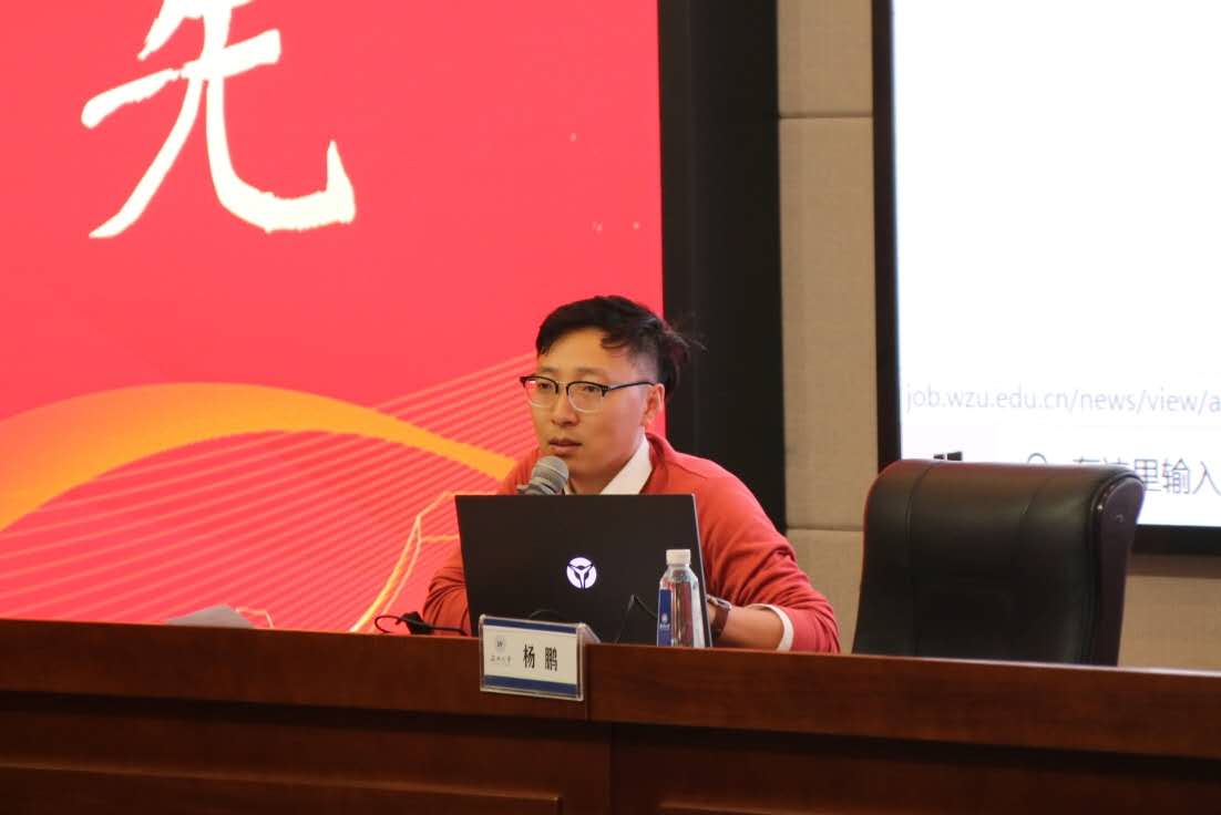 大会开始,学工办主任杨鹏老师先对就业手续、形势政策、就业 定位和应知概念等部分一一加以解读:详细讲解了beat365官网就业系统、就业微信公众号的使用;分析了近几 年的毕业生就业形势,着重列出美院本科、硕士毕业生的就业和流向数据,为21届毕业生就业提供更多 参考;普及了毕业生应该知道的一些基本概念,提醒大家注意毕业、就业的重要时间节点,办理好三方 协议、就业劳动合同等。此外,杨老师还对毕业生留温、选调、自主创业、beat365官网志愿服务西部计划和毕 业生困难补助等就业政策做了详细解读,并结合往年数据指导大家做出更准确的就业定位。最后,杨老 师提出大学生就职,忌贪心,忌急心,忌糊涂心,并通过实际案例对应届毕业生进行了就业安全的教育 。