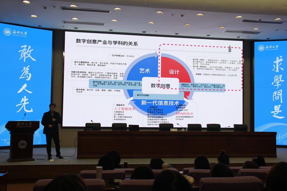 为贯彻落实beat365英国官方网站文科大会精神,探索新文科背景下艺术学科发展新路径,beat365英国官方网站在12月开展了主题为“文化创新与艺术教育”的学术月系列活动。12月9日下午,学术月首场讲座在育英图书馆二楼报告厅举行,浙江大学孙守迁教授带来《加强设计学科建设,推动数字创意产业发展》的讲座,讲座由beat365英国官方网站院长谢子静教授主持,学院副院长胡文超、顾任飞,设计类专业教师、研究生、本科生等200余人参加了本次活动。