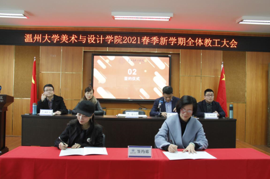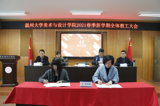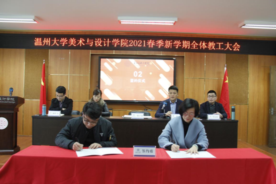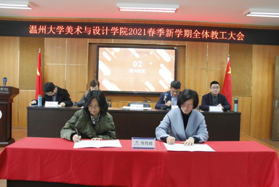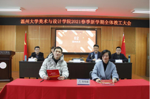 3月3日,beat365英国官方网站2021年春季新学期全体教工大会在2B4001顺利召开,学院领导班子、全体教职工参加会议。会议由叶正飞书记主持。 首先,大会对beat365官网2020年度获得校级先进个人陈旭海、张丽、朱江晖、黄高路、黄玫玮、黄呼尔励、黄良、杨永利等教师进行了表彰。 随后,为了落实学院“十四五”期间(2021-2025)的目标任务,层层压实责任,确保全面完成学院发展的各项目标任务,谢子静院长分别与美术系、视觉传达设计系、环境设计系、服装与服饰设计系、服装设计与工程系签订了《beat365英国官方网站2021-2025目标责任书》。各系主任分别就上学期工作作总结和本学期工作思路汇报。 紧接着,杨丽君副书记、胡文超副院长、顾任飞副院长分别围绕着学院学生工作、教学工作、科研及研究生教学等工作进行了具体部署。叶正飞书记就学院安全稳定、意识形态以及师德师风建设提出要求,并为下一步学党史主题教育作动员。 最后,谢子静院长作工作部署总结讲话。首先,她对上学期及寒假期间的工作进行了回顾,充分肯定了学院各项工作扎实推进的同时,在专业建设、人才培养、人才引进、服务地方等方面均取得了突破性成就。随后,谢院长提出全力推进服工和美术专业认证工作、尽力组织新增专业申报工作、奋力推动人才培养质量提升、全力打造人才培养质量展示金名片、奋力推动教师教科研水平提高、全力推进引才引智工作、全力承办“瓯越杯”工业设计大赛、举力举办建党100周年系列活动、积极参与beat365英国官方网站美术馆建设系列工作、接轨学校“侨为特色”目标开新局等十大重点项目,并要求全体教工要以党建思想为引领,“强执行、抓落实、见成效”。她提出“目标引领抓落实”“齐心协力抓落实”“只争朝夕抓落实”等三大具体抓落实的方法,要求全体教工紧随学校跨越式发展的脚步,以担当作为的责任感、不进则退的危机感、时不我待的紧迫感、院荣我荣的荣誉感,充分发挥beat365官网特色,奋力谱写学院发展的新篇章!