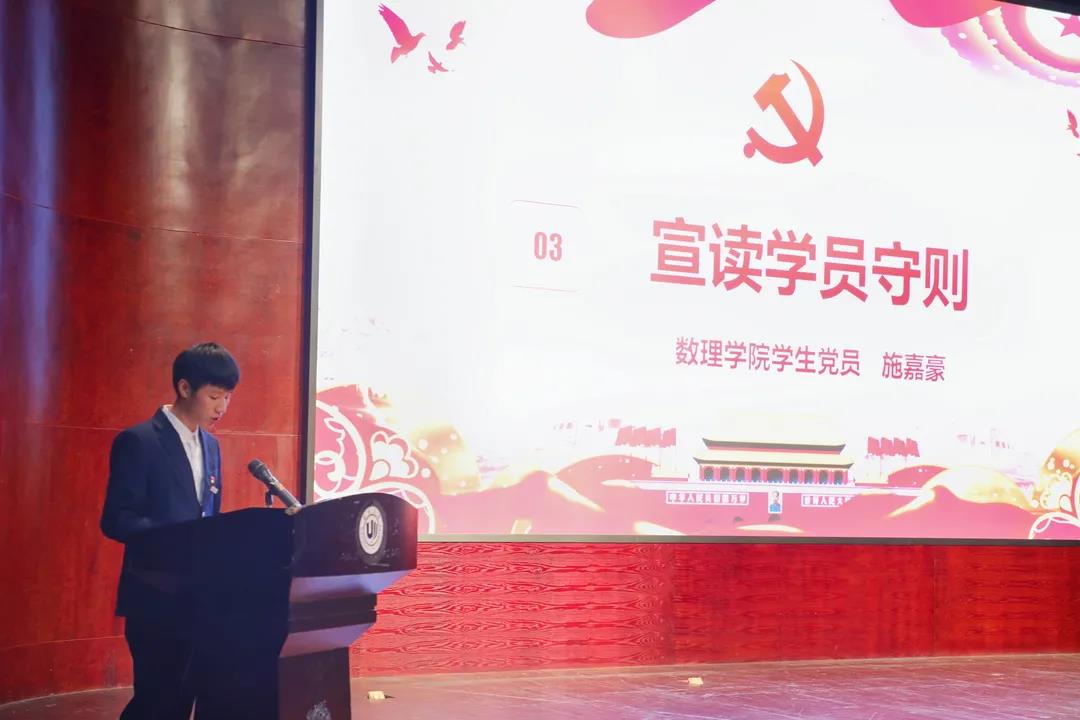 随后,数理学院的施嘉豪同学宣读《学员守则》,希望各位学生党员骨干在接下来学习中遵守守则,服从班级管理,以党员的要求严格要求自己,力争在思想上有提高,认识上有深化,学习上有收获。