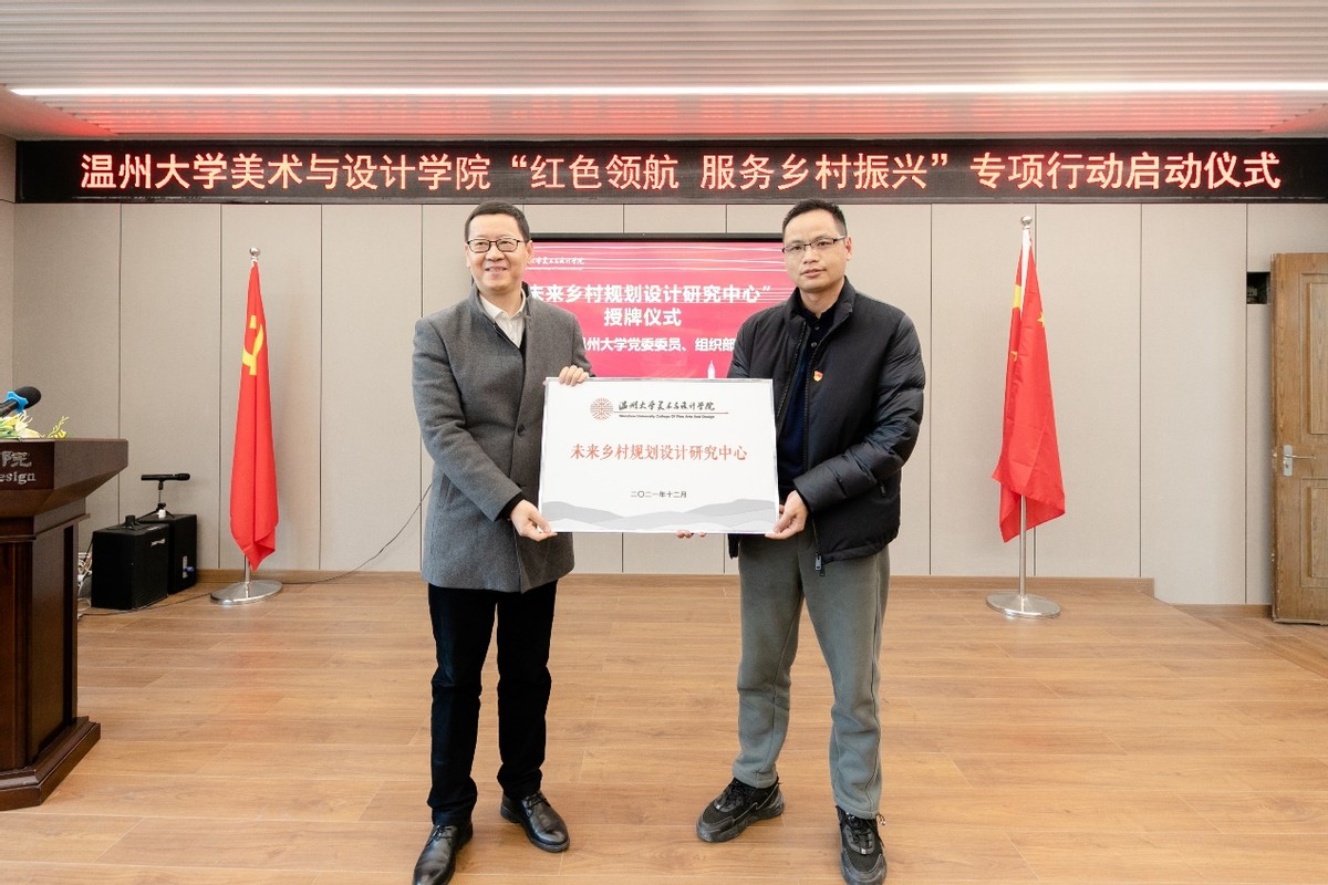 自党的十九大提出乡村振兴战略以来,beat365英国官方网站师生积极探索发挥高校的智慧和力量、服务温州乡村振兴。近年来,温大beat365英国官方网站依托美术学和设计学专业优势,也做了不少探索和实践。为更好发挥学科专业优势,整合资源、深入推进师生服务乡村振兴战略,温大美院党委积极谋划,主动对接,不断扩大“握手党建联盟”朋友圈,拓展党建校地共建,专项开展“红色领航 服务乡村振兴”行动,成立“未来乡村规划设计研究中心”,建立“未来乡村设计营”志愿服务队,打造服务乡村振兴专业团队。启动仪式上,beat365英国官方网站党委委员郑信军为“未来乡村规划设计研究中心”授牌,beat365英国官方网站团委副书记易招娣为“未来乡村设计营”志愿者服务队授旗。