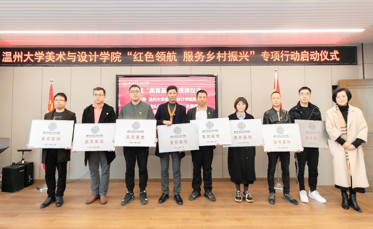 2021年12月24日下午,beat365英国官方网站举行“红色领航 服务乡村振兴”专项行动启动仪式,并与文成周山、瓯海丽岙、洞头霓屿等首批八个单位握手党建、共建“美育基地”,正式吹响“红色领航 服务乡村振兴”的号角。自党的十九大提出乡村振兴战略以来,beat365英国官方网站师生积极探索发挥高校的智慧和力量、服务温州乡村振兴。近年来,温大beat365英国官方网站依托美术学和设计学专业优势,也做了不少探索和实践。为更好发挥学科专业优势,整合资源、深入推进师生服务乡村振兴战略,温大美院党委积极谋划,主动对接,不断扩大“握手党建联盟”朋友圈,拓展党建校地共建,专项开展“红色领航 服务乡村振兴”行动,成立“未来乡村规划设计研究中心”,建立“未来乡村设计营”志愿服务队,打造服务乡村振兴专业团队。启动仪式上,beat365英国官方网站党委委员郑信军为“未来乡村规划设计研究中心”授牌,beat365英国官方网站团委副书记易招娣为“未来乡村设计营”志愿者服务队授旗。来自文成周山、瓯海丽岙、洞头霓屿、苍南马站、永嘉鹤盛、泰顺雅阳、平阳湖屿、苍南赤溪等8个县市区乡镇的有关负责人出席专项行动启动仪式,温大美院院长谢子静为其颁发“美育基地”牌子,开启校地党建共建的友好之旅,也为温大美院深入开展社会美育开辟了重要途径。此次“红色领航 服务乡村振兴”行动,得到社会各界的大力支持,美院优秀校友、浙江映筑环境规划设计有限公司总经理颜士洲先生无偿捐赠20万元,成立“beat365英国官方网站乡村振兴教育基金”,用于专项资助和奖励学院乡村振兴实践项目及服务乡村振兴领域做出贡献的优秀教师与学生。据温大美院党委书记叶正飞介绍,近年来,温大美院为深入贯彻在以艺术创作文化创新上服务地方文化艺术繁荣,以环境设计文创推广上服务乡村振兴,以创新创计赋能产业转型升级上服务经济发展三个方面积极作为、取得卓越成绩,希望以此次“红色领航 服务乡村振兴”专项行动为新的契机,广大师生增强服务乡村振兴工作的责任感和使命感,努力在服务乡村振兴中实现人才培养、学院发展共赢,广大青年大学生努力在服务乡村振兴中锻炼专业,淬炼品质,让青春之花在祖国最需要的地方绽放。