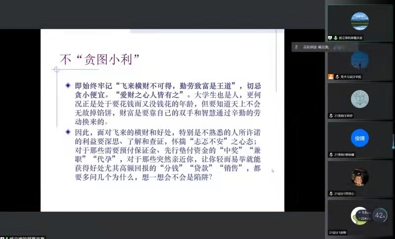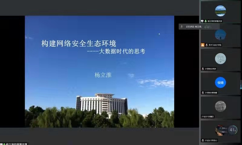 紧接着,杨立淮老师为大家讲解了在构建网络安全生态环境下对于大数据时代的思考。杨立淮老师主要从两个部分为我们进行讲解,分别是大数据时代的互联网思维及应对与阅听社会——提升媒介素养。杨立淮老师通过电商魅力与蝴蝶效应的两条教训告诉我们世界是相连的,要在大数据时代下抓住机遇,才能拥有更好的发展。而在互联网快速发展的前提下,要让互联网为我所用,而不能成为互联网的“奴隶”,老师首先分析了当代大学生媒介素养的现状,以此为前提,告诫我们“飞来横财不可得,勤劳致富是王道。”作为新时代大学生我们应谨记不要贪图小利,预防电信诈骗“六个一律、八个凡是。”所谓害人之心不可有,防人之心不可无,互联网时代与大学生息息相关,我们要提高警惕,提升防范和辨别诈骗的能力和水平,推动建设更高水平的平安校园。