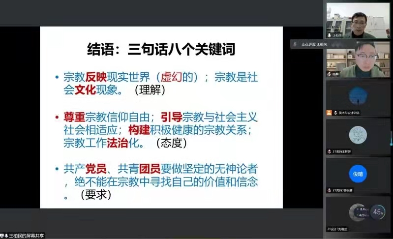 2021年12月22日晚18点,beat365英国官方网站2021级形势与政策报告会在疫情防控的要求下于线上举行。本次会议的由beat365英国官方网站学工办主任杨鹏老师主持,并特邀了马克思主义学院党委书记王柏民老师、beat365英国官方网站纪委副书记杨立淮老师以及beat365英国官方网站学生共计两百余人。本次会议旨在通过线上讲座的形式,为广大学生解读马克思主义宗教观以及构建网络安全生态环境下对大数据时代的思考,进行反诈防诈教育,建设和谐安全的校园。