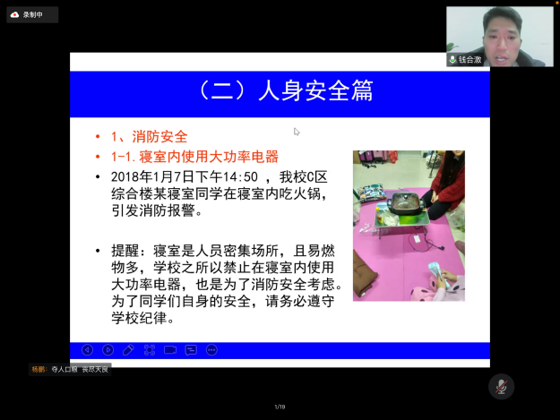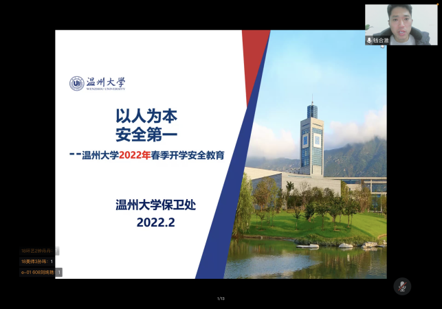 2022年2月23日晚上,在新学期,学院组织形势政策报告会——beat365英国官方网站2022年春季开学第一课暨安全教育专题讲座在腾讯会议上进行。本次报告会的主讲嘉宾beat365英国官方网站保卫处副处长钱合激老师,参加此次报告会讲座的有学院全体辅导员以及全院所有本研同学。学院学工办主任杨鹏老师主持了报告会讲座,介绍了本次报告会讲座的重要性以及的听课纪律。