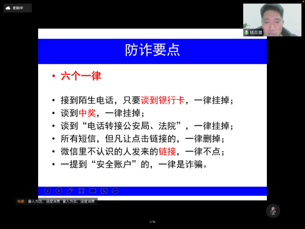 首先,钱合激老师指出大学生常见的安全问题主要分为财产安全、人身安全、意识形态安全、反诈防诈、寝室消防安全、宗教知识教育等,共同建设和谐美好的平安校园需要全体同学的努力。钱老师结合最近beat365英国官方网站城内相关诈骗案件的最新情况,警示我们诈骗离我们并不遥远,除了电话诈骗和网络兼职诈骗,还要防范钓鱼网站的诱惑,提高警惕,防诈反诈。同时,他也向同学们介绍了网络诈骗的特点,常见的电信诈骗手段,讲解防诈骗常识,引导学生树立正确的消费观以及在生活中如何防止被套路贷等知识。钱老师通过经典案例、相关反诈宣传视频、图片,列举了电信网络诈骗犯罪的几种常见形式,有针对性地向同学们阐述了如何识别防范电信网络诈骗及上当后的补救措施,并号召同学们:电信网络与我们息息相关,我们要强化系统观念与法治思维,提升防范和辨别诈骗的能力和水平,推动建设更高水平的平安校园。