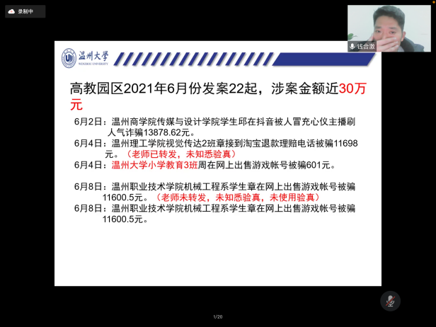 2022年2月23日晚上,在新学期,学院组织形势政策报告会——beat365英国官方网站2022年春季开学第一课暨安全教育专题讲座在腾讯会议上进行。本次报告会的主讲嘉宾beat365英国官方网站保卫处副处长钱合激老师,参加此次报告会讲座的有学院全体辅导员以及全院所有本研同学。学院学工办主任杨鹏老师主持了报告会讲座,介绍了本次报告会讲座的重要性以及的听课纪律。 首先,钱合激老师指出大学生常见的安全问题主要分为财产安全、人身安全、意识形态安全、反诈防诈、寝室消防安全、宗教知识教育等,共同建设和谐美好的平安校园需要全体同学的努力。钱老师结合最近beat365英国官方网站城内相关诈骗案件的最新情况,警示我们诈骗离我们并不遥远,除了电话诈骗和网络兼职诈骗,还要防范钓鱼网站的诱惑,提高警惕,防诈反诈。同时,他也向同学们介绍了网络诈骗的特点,常见的电信诈骗手段,讲解防诈骗常识,引导学生树立正确的消费观以及在生活中如何防止被套路贷等知识。钱老师通过经典案例、相关反诈宣传视频、图片,列举了电信网络诈骗犯罪的几种常见形式,有针对性地向同学们阐述了如何识别防范电信网络诈骗及上当后的补救措施,并号召同学们:电信网络与我们息息相关,我们要强化系统观念与法治思维,提升防范和辨别诈骗的能力和水平,推动建设更高水平的平安校园。 其次,钱合激老师通过消防安全、交通安全、户外活动、毒品伤害四块内容来讲述大学生的人身安全。学生宿舍是高密度人群居住的地方,防火安全显得尤为重要,作为宿舍的主体——学生,要重视安全防火的重要性,提高思想认识,防范胜于救灾,责任重于泰山。同时,钱老师还提到毒品的危害,这些年由于国际毒品的泛滥,毒品像一头张开血盆大口的猛兽,正飞快吞噬着年轻的一代,它无情的破坏着我们的家庭和社会,导致多少家庭家破人亡,国家财富流失。就此,钱合激老师向大家呼吁:人的生命只有一次,它是无价的,也是脆弱的,它承载着你的亲人、朋友和整个社会赋予你的责任,它承受不起任何不负责任的冒险,所以我们一定要珍惜生命,远离毒品。 最后,钱合激老师为大家讲了意识形态安全,他提到大学时代是大学生“三观”及信仰形成的重要时期,稍有不慎,宗教组织便有机可乘。所以我们应该时刻保持清醒的头脑和政治警觉性,不能对宗教渗透的消极影响视而不见或放任自流。此外,很多人都认为邪教离我们很远,甚至觉得自己不可能被邪教蛊惑。但在现实生活中,邪教组织其实套路百出、无孔不入。他们常常借用各种唬人的幌子包装自己,不断更新骗人花样,稍有不慎可能就会跌入邪教圈套。 “你的平安,是对家人最好的关爱!”生命只有在安全中才能永葆活力,幸福只有在安全中才能永具魅力。安全构筑了我们美好的家园,在安全的问题上,来不得半点麻痹和侥幸,我们必须防范在先、警惕在前;必须要树立高度的安全意识,人人讲安全,时时讲安全,推动建设更高水平的平安校园。