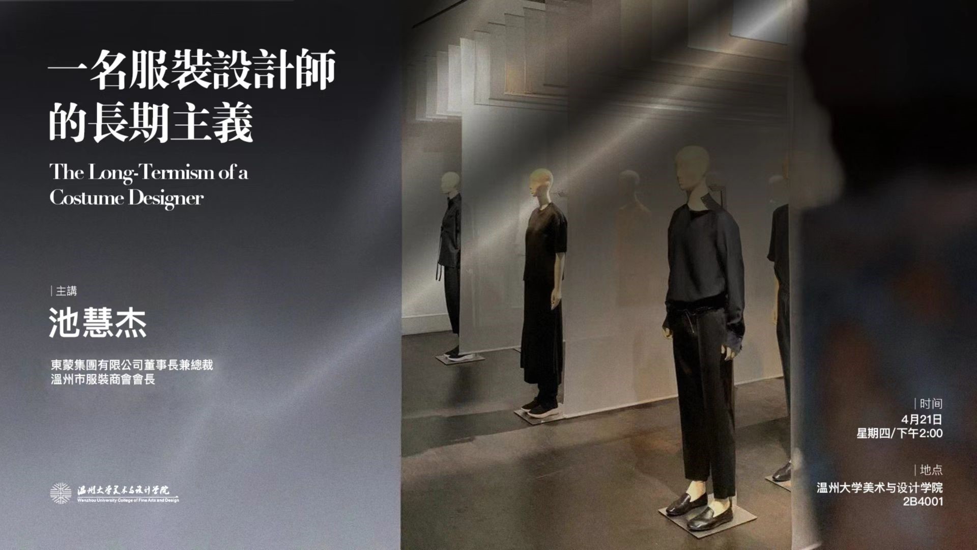 讲座中,池慧杰先生从“判断自己适合不适合服装行业的职业发展”、“做难而正确的事”、“把事物的对立面放在一起又能前进”三个维度阐述了一名服装设计的长期主义观点; 通过结合自身创业经历,讲述了如何通过长期的坚持和不懈的努力,取得职业和事业的发展。