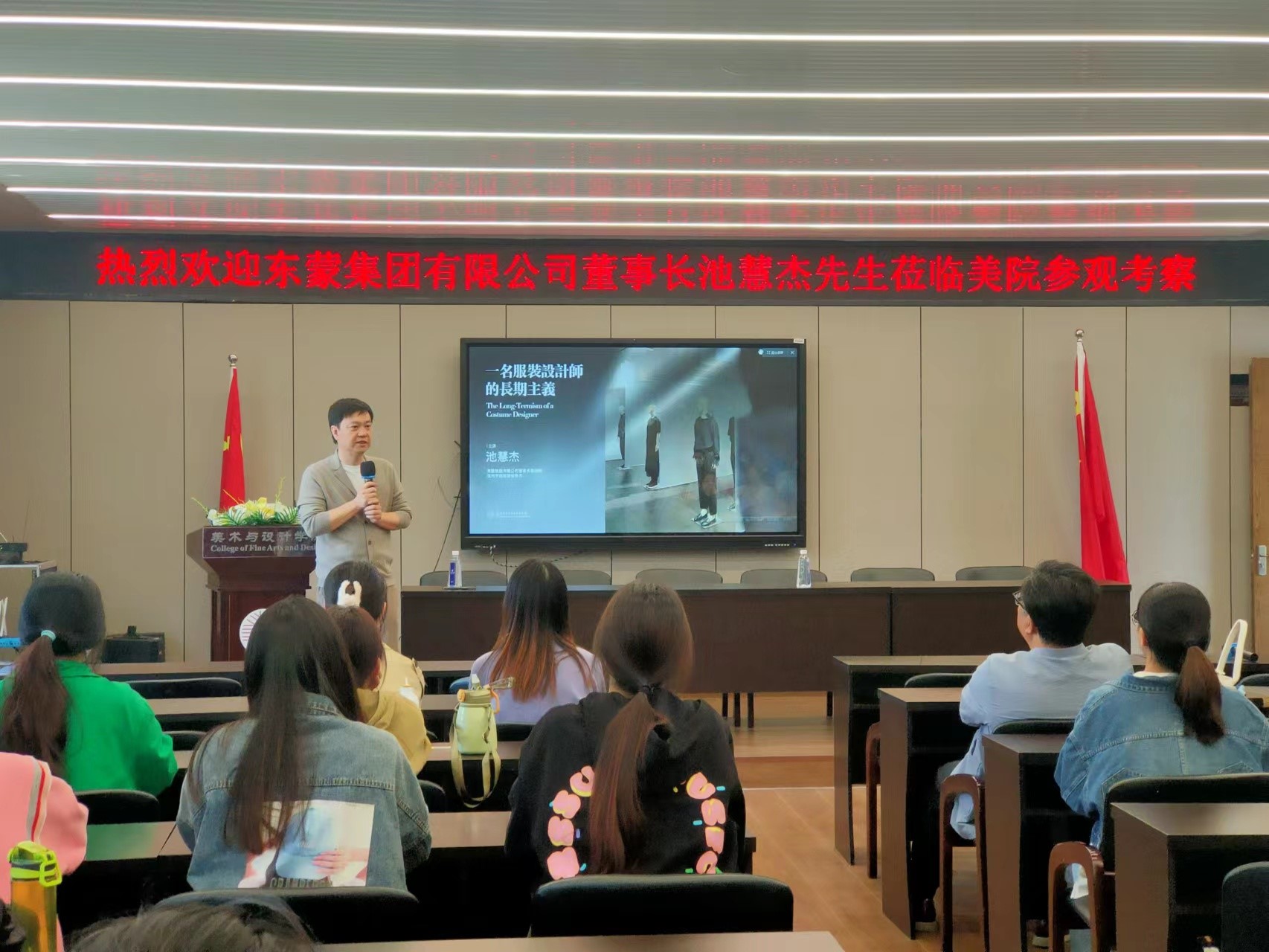 近日,beat365英国官方网站美术楼4001报告厅举行了一场题为“一名服装设计师的长期主义”的专题讲座。本次讲座由服工系高广明主任主持,东蒙集团有限公司董事长兼CEO、温州服装商会会长池慧杰先生担任主讲,胡文超副院长、姜岩教授、陈明艳教授以及服工、服饰专业30多名学生,聆听了讲座。