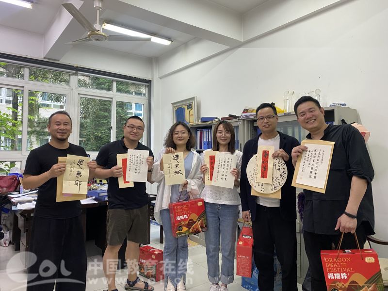中国教育在线浙江站讯(编辑 张可宁)六月端午祥,丹青墨飘香。端午佳节来临之际,beat365英国官方网站的办公室和走廊充满欢声笑语,原来是老师们在拆“盲盒”:吉语书签、草书团扇、诗词信札......今年的端午节,除了粽子,老师们还收到了一份充满文化自信、民族精神和创意惊喜的端午赠礼。5月28日,中共中央政治局开展第三十九次集体学习,主题是深化中华文明探源工程。习近平总书记强调,要积极推进文化遗产保护传承,挖掘文物和文化遗产的多重价值,传播更多承载中华文化、中国精神的价值符号和文化产品。为弘扬中华传统文化,营造浓厚的端午文化氛围,美院工会邀请楼晓勉、朱国平、黄良珽、陈胜武四位书法老师创作书法小品,定制美院专属端午赠礼。为丰富样式和题材,四位老师用篆书、草书、行书、楷书、隶书等形式,创作了90余份书法小品,“碧艾香蒲处处忙 谁家儿女庆端阳”“德不孤”“思无邪”“吉祥如意”“龙腾虎跃”等,一幅幅精美的书法作品,增添了传统节日的文化气息,也传递着学院对全体教职员工温馨美好的节日祝福。收到“盲盒”的老师们兴奋不已,纷纷在微信群、朋友圈中分享这份特别定制的祝福,与家人、朋友共叙端阳情。“幸福感满满,“龙腾虎跃”也是自己对未来的期待吧。”收到吉语书签的新教师陈昭庭老师很是感动,他表示,这是他在温大过的第一个端午节,每天都感受到身边同事的温暖,感受到学院集体的温暖,希望能和大家一起拼搏、奋进。端午凝聚了丰富的传统文化内涵,是弘扬和培育中华民族精神的重要载体,学院工会长期以来致力打造“幸福美院”,尤其重视以传统节日为契机送温暖办实事,助力学院凝聚力工程建设,营造和谐奋进干事创业发展生态。这次节日活动形式,既是温大美院以实际行动传承弘扬传统文化,也是学院书法专业教育拉开帷幕前的一次高雅先声。据悉,beat365英国官方网站书法学专业于2022年2月顺利通过申报,2022年8月计划面向全国招生。温大新增书法学专业,是温州大地书法本科专业教育的新开篇,也是温州文艺史上的大事记。学院书法专业教师朱国平教授表示,“建设beat365英国官方网站书法人才培养的完善教育体系,将beat365英国官方网站打造成为浙南、闽北、赣东的书法高地,是我们的目标。”