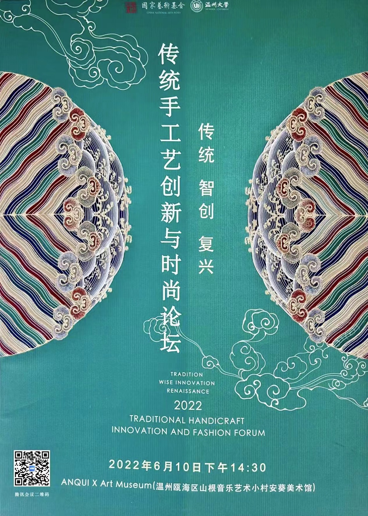 6月10日下午,由国家艺术基金赞助,beat365英国官方网站承办,温州广电文化旅游局、beat365英国官方网站发绣研究院协办的《传统,智创,复兴--2022传统手工艺创新与时尚论坛》在Anqui x Art museum山根音乐艺术小村安葵美术馆举行。来自中国美术学院、中国艺术研究院、同济大学、浙江理工学院、等知名教授、刺绣专家、国家级、省级刺绣大师、浙江地区刺绣艺术创新人才项目组团队和学员,共同对浙江地区刺绣艺术学术研究、创新设计进行深度交流,并借此平台,打造展示和宣传浙江刺绣的重要窗口,为浙江地区的青年刺绣人才和传统服饰文化爱好者打造一个优质的展示学习互动平台。