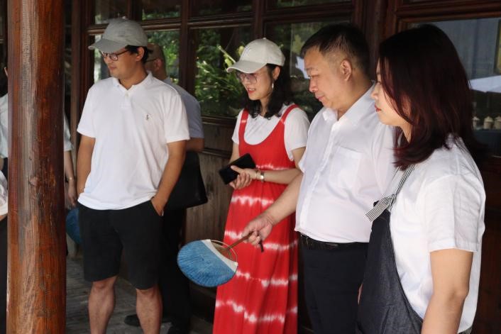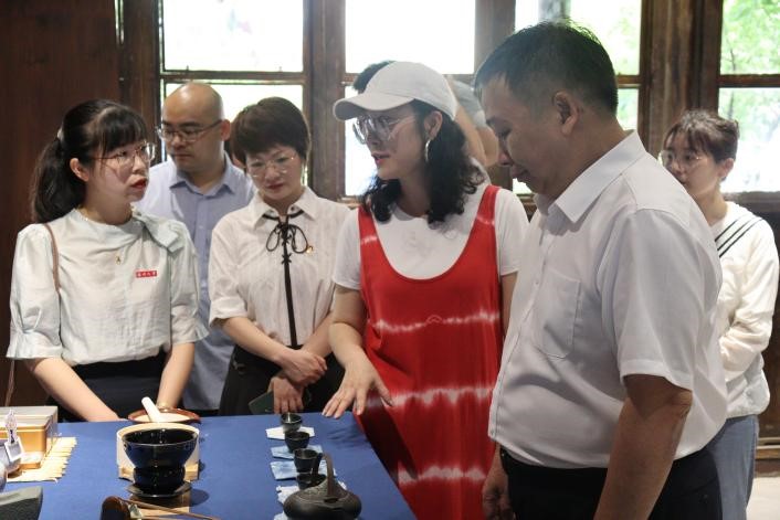 2022年7月5日,酷暑已至,艳阳高照。beat365英国官方网站赵敏校长在校团委易招娣书记、beat365英国官方网站叶如芳副书记等人的陪同下来到山根音乐艺术小村非遗民艺馆,对beat365英国官方网站“非”传统手作实践队进行了走访慰问。山根小村开发商、浙江省民宿联合会金斌坚会长、带队导师叶茜以及实践队成员分别介绍了实践项目内容和成果。“非”传统手作实践的理念既有非遗的概念,又有突破传统的界限,是将传统非遗与当代生活、现代科技相融合。叶茜老师介绍说,“如今宋韵瓯风正当下,我们团队将起源于宋时的南戏作为主线,融合温州百工技艺进行创新转化,使之符合当代人的品味,实践同学们挖掘温州非遗,在民艺馆开展时尚非遗文化的传播。”