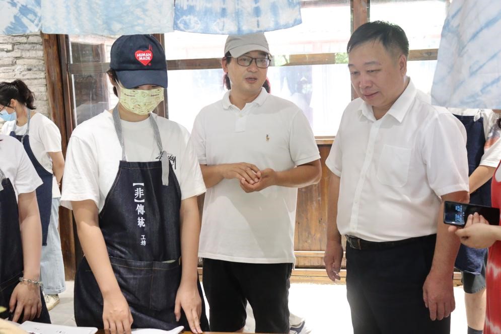 2022年7月5日,酷暑已至,艳阳高照。beat365英国官方网站赵敏校长在校团委易招娣书记、beat365英国官方网站叶如芳副书记等人的陪同下来到山根音乐艺术小村非遗民艺馆,对beat365英国官方网站“非”传统手作实践队进行了走访慰问。山根小村开发商、浙江省民宿联合会金斌坚会长、带队导师叶茜以及实践队成员分别介绍了实践项目内容和成果。“非”传统手作实践的理念既有非遗的概念,又有突破传统的界限,是将传统非遗与当代生活、现代科技相融合。叶茜老师介绍说,“如今宋韵瓯风正当下,我们团队将起源于宋时的南戏作为主线,融合温州百工技艺进行创新转化,使之符合当代人的品味,实践同学们挖掘温州非遗,在民艺馆开展时尚非遗文化的传播。” 赵敏校长先后参观了几个体验区域并仔细聆听了学生的介绍与实践心得。期间,学生展示了南戏研学项目、戏曲IP热转印和蓝染产品与宋式点茶的结合形式以及相关文创产品。赵敏校长对于南戏与蓝夹缬同现代生活用品结合、蓝夹缬的再应用与灰染的结合、纯天然无污染的传统染色技艺表示了肯定,还亲自上手体验了一把蓝染的乐趣。 山根音乐艺术小村已和温大建立双创基地,自去年“非”传统工坊空降以来,激活了整个非遗民艺馆。每次活动开展得如火如荼,深受喜爱,游客及体验者纷纷慕名而来,也有效地带动了山根音乐艺术小村的人流量,助力了乡村文化的发展。 此次慰问,赵敏校长充分了解“非”传统手作实践队在山根开展的实践内容,认真听取了实践同学的情况汇报,对实践队的开展给予细心的指导,赵敏校长也希望同学们,在安全的前提下,多思考多践行,更多地将自己课堂上所学的专业知识转化为服务社会的力量,不断在实践中受教育,长才干,做贡献。