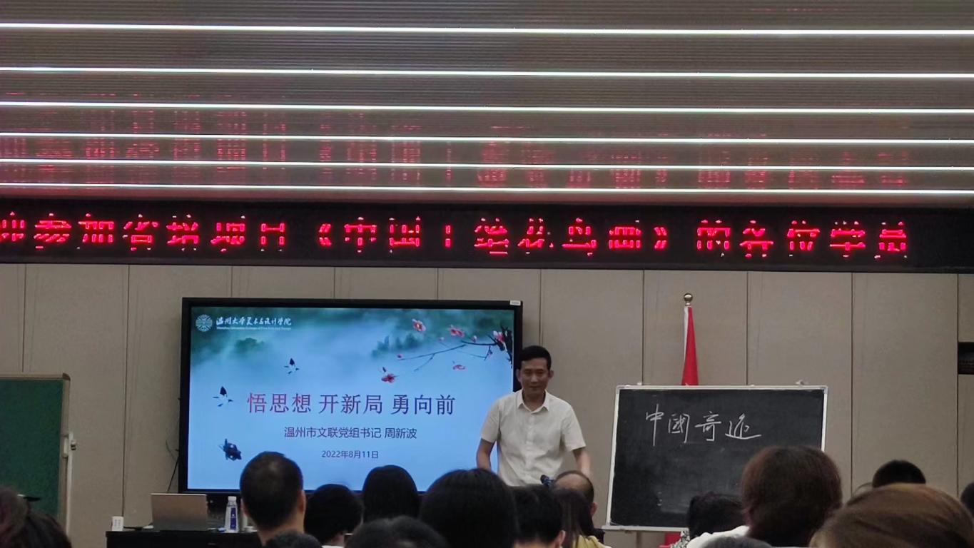 2022年8月11日下午两点,在由beat365英国官方网站举办的省培项目——《中国工笔花鸟画》课程中,温州市文联党组书记周新波同志受邀对全体参加此次培训的中小学教师进行了以“悟思想,开新局,勇向前”为主题的专家讲座交流。beat365英国官方网站院长谢子静、副院长胡文超、继续教育中心主任邹青、团委指导老师石建林,以及全体参训教师一同参与此次活动。周新波书记结合自身的教育经历和工作经验,以悟思想、开新局、勇向前三个方面展开论述,从理论高度到实践层面对教师学员们做了具体的建议。本次讲座既有理论方向的指引又有生活处事的智慧,讲座受到与会学院领导和参训教师学员的一致好评。悟思想:首先,周新波书记以“两个确立”为指引,提问全体教师学员。在一问一答的形式中加深了教师学员们的印象,深刻明白了“两个确立”指的是确立习近平同志党中央的核心、全党的核心地位,确立习近平新时代中国特色社会主义思想的指导地位。同时,也向各位教师学员传递了党的十九届六中全会精神以及中国共产党浙江省第十五次代表大会精神。鼓励学员们要贯彻落实好这些指示精神,具备良好的素质,坚定意识形态,把握住中华文化的前进方向和发展道路。开新局:接着,周新波书记从党的百年奋斗重大成就和历史经验出发,历数发生在中华大地的各种各样的伟大奇迹,绘制出新时代中国特色社会主义社会发展新局面,强调中国在完成第一个百年奋斗目标的同时,正在朝着下一个百年奋斗目标继续奋勇向前,激发教师学员为祖国繁荣富强贡献自己的青春智慧。勇向前:最后,周新波书记从日常生活的角度和教师学员讨论人生智慧,在生活中奋勇向前,把自己的生活小秘诀传授给大家,总结了三句话,“学会及时归位、尽量形成闭环、力求丰富多彩”。周新波书记以十分接地气的语言和文字表达出自己的生活态度,让教师学员们在喜悦的氛围中受益匪浅。同时祝愿各位教师学员在今后的生活和工作中,继续保持良好的心态,积极学习,努力工作,提升自己的同时也为社会的发展做出自己的贡献,也希望参加本次培训的教师学员都能够从中收获满满。整个讲座,周新波书记通过理论思想和一个个的真实生活案例相结合,生动地向参训学员们分享了自身的所见所闻所感,受到了与会领导和教师学员们的一致好评。