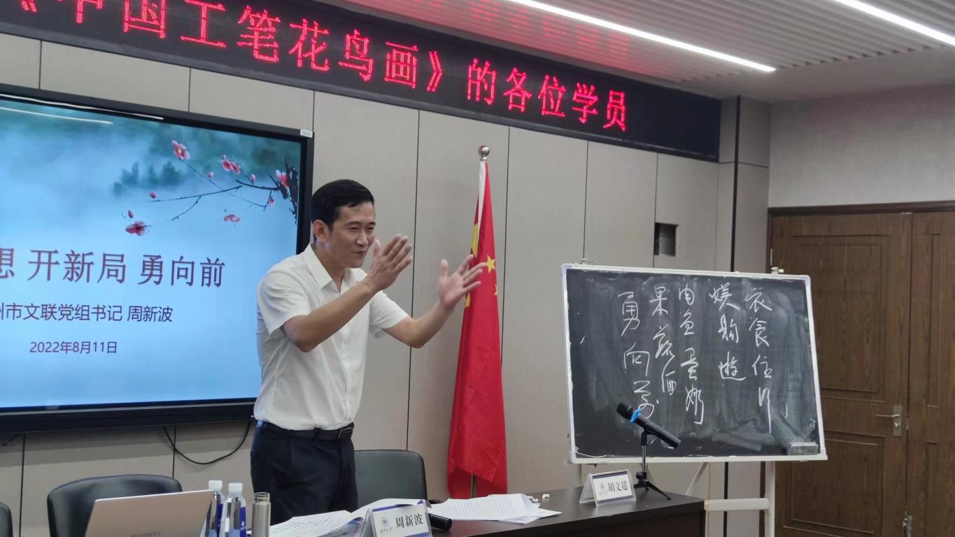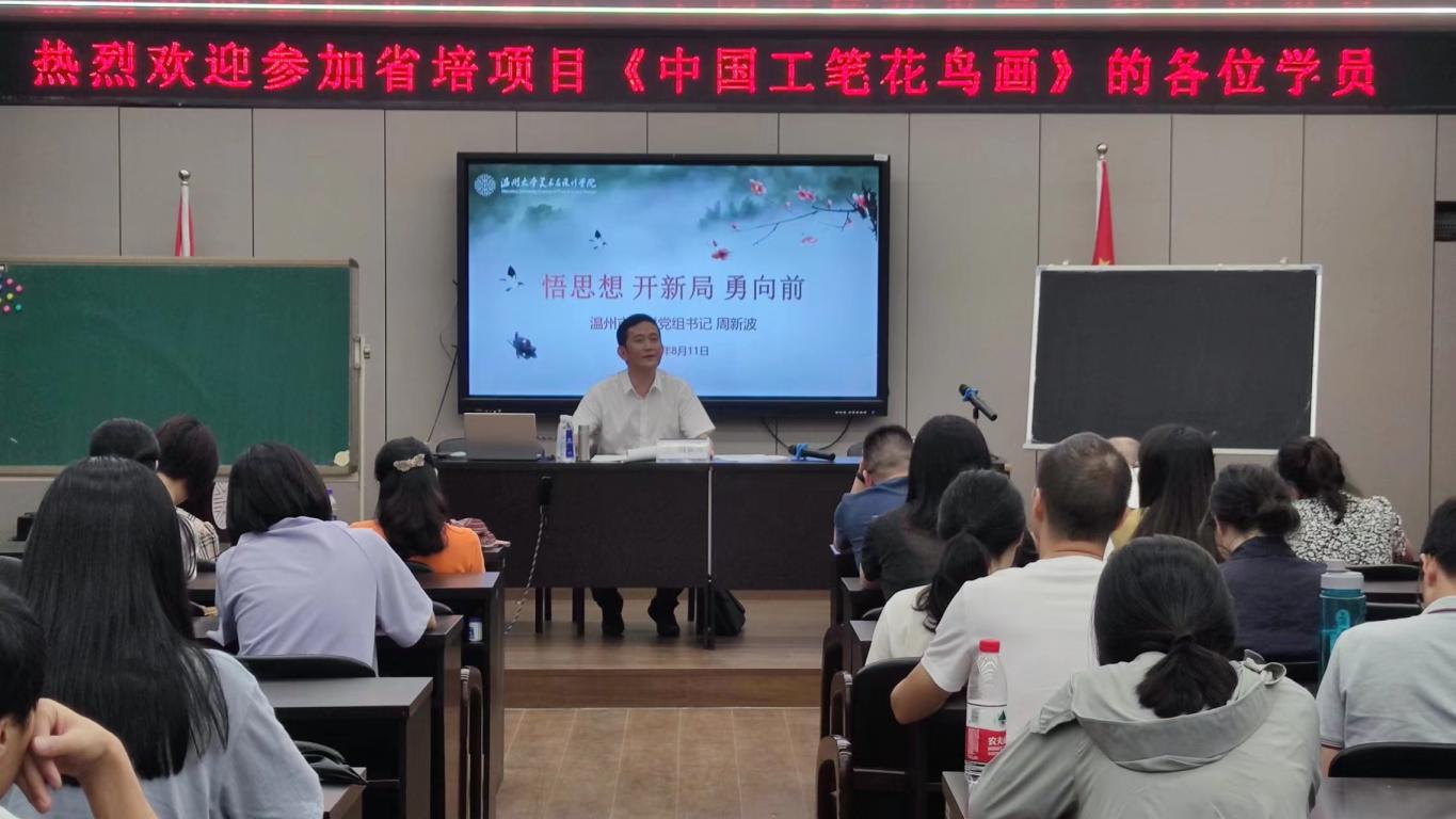 2022年8月11日下午两点,在由beat365英国官方网站举办的省培项目——《中国工笔花鸟画》课程中,温州市文联党组书记周新波同志受邀对全体参加此次培训的中小学教师进行了以“悟思想,开新局,勇向前”为主题的专家讲座交流。beat365英国官方网站院长谢子静、副院长胡文超、继续教育中心主任邹青、团委指导老师石建林,以及全体参训教师一同参与此次活动。