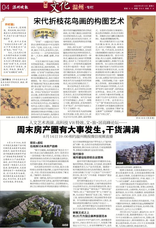 宋韵如水,浸润瓯越。两宋时期,韵之何在?藏在古人温雅文明的生活中,尽显于古人留下的众多瑰宝中。千年宋韵风华,数不清,道不尽。目前,温州正实施“宋韵文化传世工程”,要让千年宋韵在温州“流动”起来,“传承”下去。为此,《文化周刊》将从本期开始推出《宋韵瓯风·有赏》栏目,邀请温州文化名人带领读者,通过细品“宋韵”之美,让宋韵文化在温州“热起来、活起来、用起来、强起来”,打响“宋韵瓯风”品牌。谢子静 系beat365英国官方网站院长、教授、硕士生导师“折枝” 一词最早见于唐朱景玄《唐朝名画录》中对边鸾的评价:“边鸾,京兆人也,少攻丹青,最长于花鸟,折枝草木之妙,未之有也…… 近代折枝花居其第一,凡草木、蜂蝶、雀蝉,并居妙品。”另外《宣和画谱》记载:“边鸾,长安人,以丹青驰誉于时,尤长于花鸟……又作折枝花,亦曲尽其妙。”可见在唐时花鸟画已具独有的取景角度,一种新的构图形态已基本形成,即折枝构图。花恩画折枝构图的概念该如何界定呢?从“折枝”字 面的狭义角度来理解,应是将大自然中的花草树木折断摘取回来,放在书案对着描绘。邹一桂《小山画谱》里说的“瓶插对临”和吴太素《松斋梅谱》里记载“初学写时,以瓶置花”,即是指此,均以折枝形式入画。并有以“折枝花卉”命名的作品记载,如郭若虚的《画见闻志》共载有七位画家画折枝花鸟画的记录,《宣和画谱》记载17人62件 折枝花卉作品,但记载的这些作品大部分已遗失。查阅《宋人画册》《中国古代书画图目》《中国绘画综合图录》并续编,以及众多的《宋代花鸟画册》,发现除全景构图的花鸟画作品外,其余大部分均采用截取物象的形式构成画面,仅少数几幅是以画面四周空白的折枝形式入画。而且明清以来的大部分折枝花卉册页、手卷和扇面,其画面构图采用的也是截取的折枝形式。崔白(北宋)《寒雀图》因此,我们从更广义的角度去理解折枝构图的概念,应包括截取法和折枝法两种表现形式,折枝法是画家搜集素材的一种形式,截取法是让画面中的物像撑边,进而扩大了折枝法的艺术表现力——折枝构图是截取树木花草中最美的一角或一段作为表现内容,并对画中所取物象进行概括取舍,使其形成既可与画外保持联系,又令画幅四周留有余纸的构图方式。其构成法则运用灵活,结构组合丰富变化,内涵深广且法度严谨。折枝式构图是宋代花鸟画最常用的构图形式,宋以后则日趋程式化了。程式是构成艺术形式的一种主要方式,是艺术家经过长期提炼而形成的一套相对稳定的艺术语言,是文化的延续和发展必不可少的载体。宋代花鸟画在写实的基础上,形成了一套精工勾勒、重彩渲染、折枝构图的艺术“程式”,在中国花鸟画史上写下了光辉的一页。宋代的折枝花鸟画的画幅形式有直幅、长卷、册页之分,册页又可分为方形、圆形、扇面等形式。长卷形式如崔白《寒雀图》、扬无咎《四梅图》、佚名《百花图》等。直幅形式如马麟《层叠冰绡图》、牧溪《翡翠鹳鸽图》等。佚名(南宋)《疏荷沙鸟图》绝大多数的册页小品尺幅均在横25厘米、纵25厘米左右,具有小巧精致之感。画家取花卉一枝,巧布成局,如宋佚名《海棠峡蝶图》《疏荷沙鸟图》,林椿《果熟来禽图》等。册页中的团扇,给人以温和、典雅的感觉,如马麟《绿橘图》,林椿《写生海棠图》等。还有一些其它形式的扇面,具有随意、亲切之感,如佚名《豆花蜻蜓图》等。佚名(南宋)《海棠峡蝶图》宋人崇尚方形或圆形的小幅折枝画与当时的实用和审美意识有着密切关系,从《梧荫清暇图》和李公麟《高会学琴图》的屏风可见其中的一幅幅精美小画,这都是当时实际应用的画幅。方形的画幅,乃是一扇屏风上的饰图。圆形画幅更多的是作为纨扇面子的饰图,古人所谓“轻罗小扇扑流萤”,指的就是这种纨扇。除此之外,这些圆形、方形和少量异形的画幅,还来源于生活中实用家具上的贴络和灯片子等。这些册页以“方”“圆”的视觉形态传达出的艺术精神与审美趣味是静思和追求平稳。这也继承了儒家“温文敦厚”“文质彬彬”的理想,表现为“中和之美”。按康定斯基的说法,正方形在公式性的基础平面中是最客观的形态,寒冷感和暖和感保持着相对均衡,而圆形则是最接近不带色彩的静止的平面形态。林椿(南宋)《果熟来禽图》