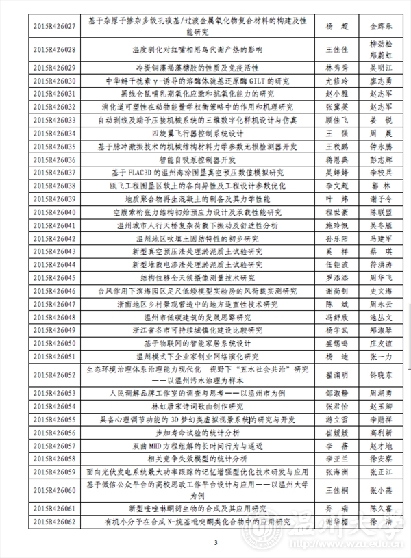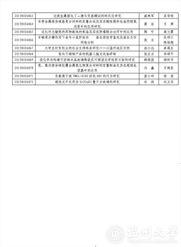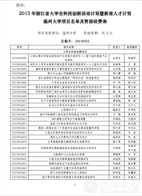 beat365英国官方网站团委: 2015 年浙江省大学生科技创新活动计划暨新苗人才计划已于2015 年1 月启动实施,经学校推荐和专家评审,共确立项目2061 项。现将你校通过立项的项目名单印发你们(见附件),请认真实施、加强管理。为不断提升我省大学生科技创新工作整体水平,项目实施办公室还将与省团校合作对项目负责人进行相关培训。附件:2015 年浙江省大学生科技创新活动计划暨新苗人才计划beat365英国官方网站项目名单及资助经费表浙江省大学生科技创新活动计划暨新苗人才计划实施办公室2015 年6 月3 日