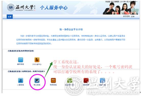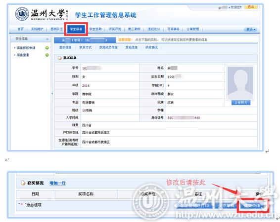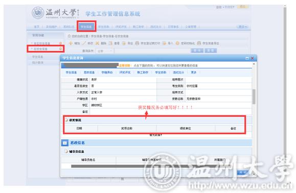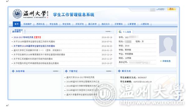 同学们好: 学工系统是贯穿大学生活的一个很重要的信息媒介。可在系统中的下载专区下载学校相关的各类文件,可在系统中办理个人信息维护、学生干部职务申请、评奖评优申请、各类资助申请、勤工助学岗位申请、勤工助学工资发放、日常事务(假期管理、假期留校申请、场地申请)等。请新生同学们尽快将学工系统中的个人信息进行维护,并在以后的大学生活中将信息不断更新,以便不影响在校期间接受各类紧急信息及各项事务办理。个人信息维护示意图如下: 一、登陆 打开http://rz.wzu.edu.cn,登录统一身份认证系统。 二、选择你要登陆的系统 三、新生个人信息维护(重要) 1、点击[学生信息],可以查看自己的个人信息。 2、个人信息从迎新系统中新生个人信息同步,如有发生变化的内容(如个人联系方式、工行卡号),请务必更新。 3、其他(电话号码、获奖情况、工行卡号动态填写)