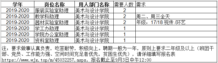 现各办公室招募勤工岗位,要求做事认真负责,吃苦耐劳,积极向上。聘期一般为一年,原则上要求二年级及以上(班团干部、党员、工作能力强优先,空闲时间充足者优先,贫困生优先),请详细填写报名表https://www.wjx.top/m/45032257.aspx,报名截止至9月3日中午12:00。