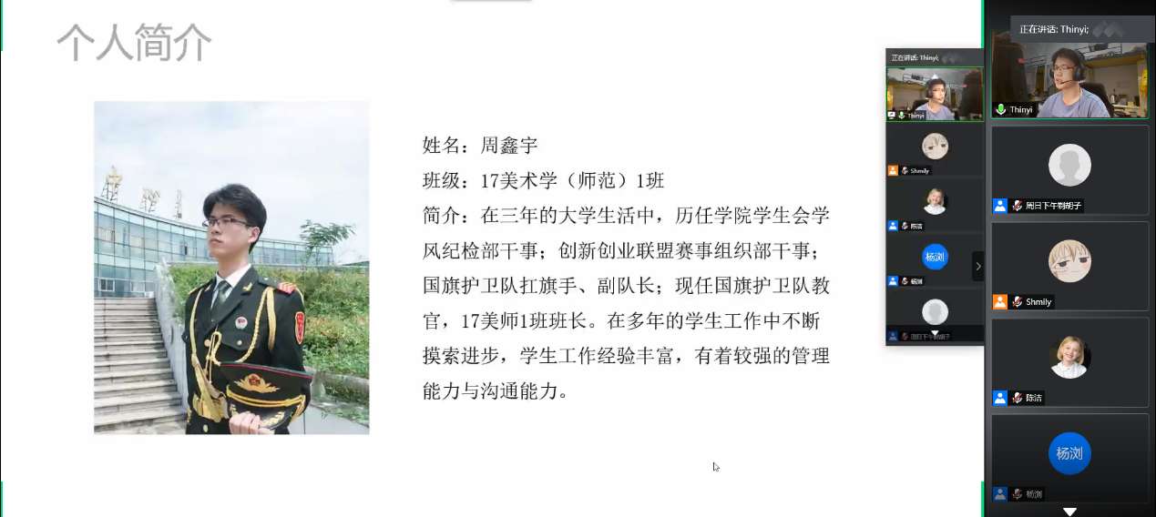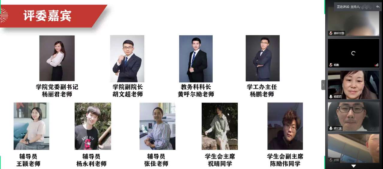为推动学院学风建设,培养良好的院风学风,2020年6月3日晚上,beat365英国官方网站学风建设推进会暨2019-2020学年五班十星评选活动在线上成功举行。本次活动面向全体美院学子,本次评选的评委有beat365英国官方网站党委副书记杨丽君老师、副院长胡文超老师、教务科科长黄呼尔励老师、学工办主任杨鹏老师、辅导员杨永利老师、辅导员张佳老师,以及学生会主席祝晴同学、学生会副主席陈励伟同学。
