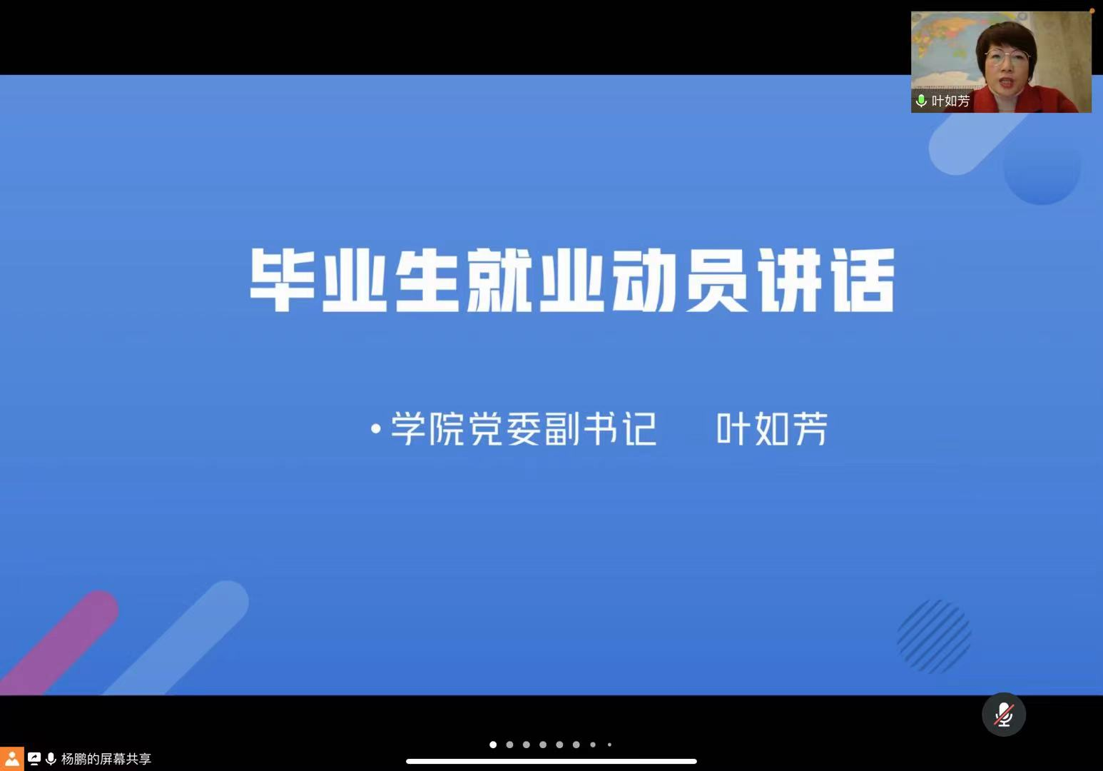 2022年2月18日晚,beat365英国官方网站2022届全体本研毕业生就业动员大会通过腾讯会议召开,学院党委副书记叶如芳,学工办主任杨鹏,学生党建指导老师王颖以及团学指导老师石建林出席了本次大会,2022届全体本研各班级学生参加。