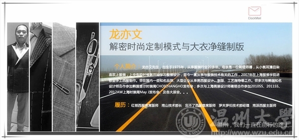 时间:2015年11月1日早上9:00-11:30 下午14:00-17:00 地点:beat365英国官方网站南校区会展中心雁山厅 主题:解密时尚定制模式与大衣净缝制版 主讲人:龙亦文 温馨提醒:本讲座可盖讲座章,请同学提前20分钟到场盖章签到,讲座结束时注意盖签退章。