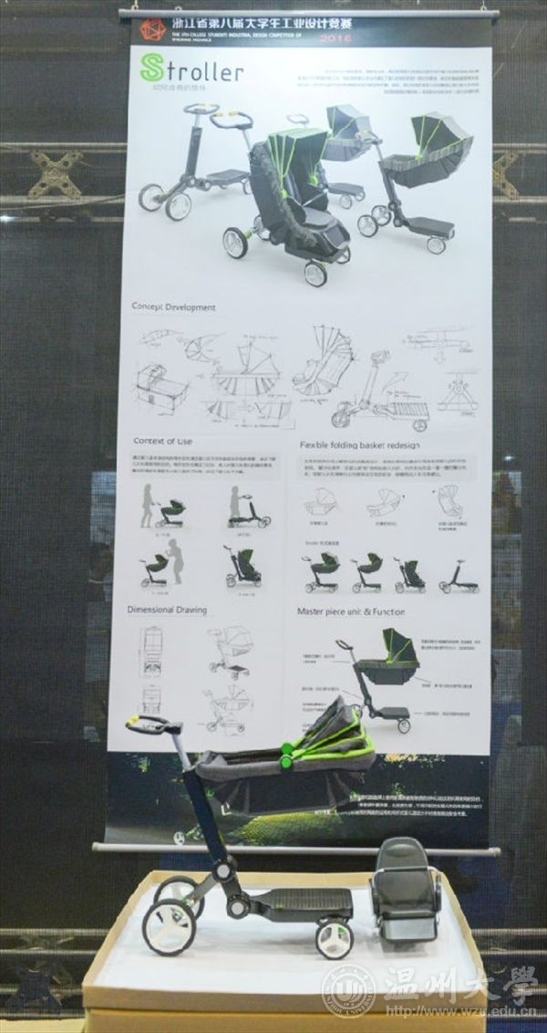 同样,来自该校的戚志政喜欢产品设计也有较好的创意,这次他带来的是一款集摇篮、婴儿车、滑板车于一体的婴儿车,他说:“这款婴儿车基于婴儿的成长所设计,能随着婴儿的行为学习做出改变。打破规矩的婴儿篮可以如虾一般弯曲,同时随着年龄增长,婴儿车还可以转换为滑板车,变废置为玩物。基于安全的考虑,还设置了光织警示带,让其在具有警示功能下又不失美感。”