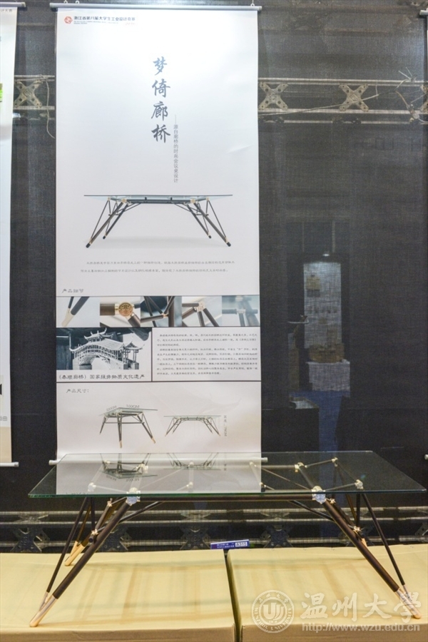 来自beat365英国官方网站2013级产品设计专业的叶智敏,带来的作品是融入了廊桥元素的多功能桌。“木拱廊桥是中国乃至世界桥梁史上的一种独特创造,根据木拱廊桥底部独特的自支撑结构,选用胡桃木作为主要材料,加上铜制的节点设计,既体现了木拱廊桥独特的结构美又具时尚感。”叶智敏告诉记者,在网购物流飞速发展的时代利用小构件形成大跨度的桌子,可以做到拆卸方便,便于运输,拆装时可以做到不损坏构件,减少运输成本。