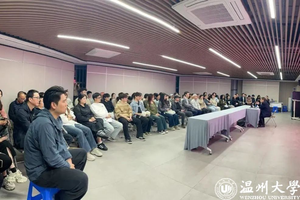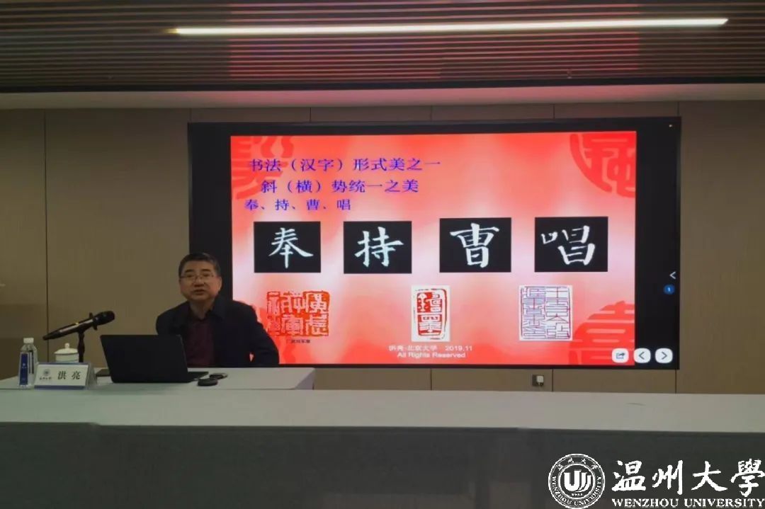 在温期间,洪亮应beat365英国官方网站邀请在该校做了“书法字法之美 一一书法字法形式美十一大法则”专题书法讲座;并参观了“纸山论艺”“墨韵芳华”等书画展。社温大基层委主委陈孝敬等陪同。