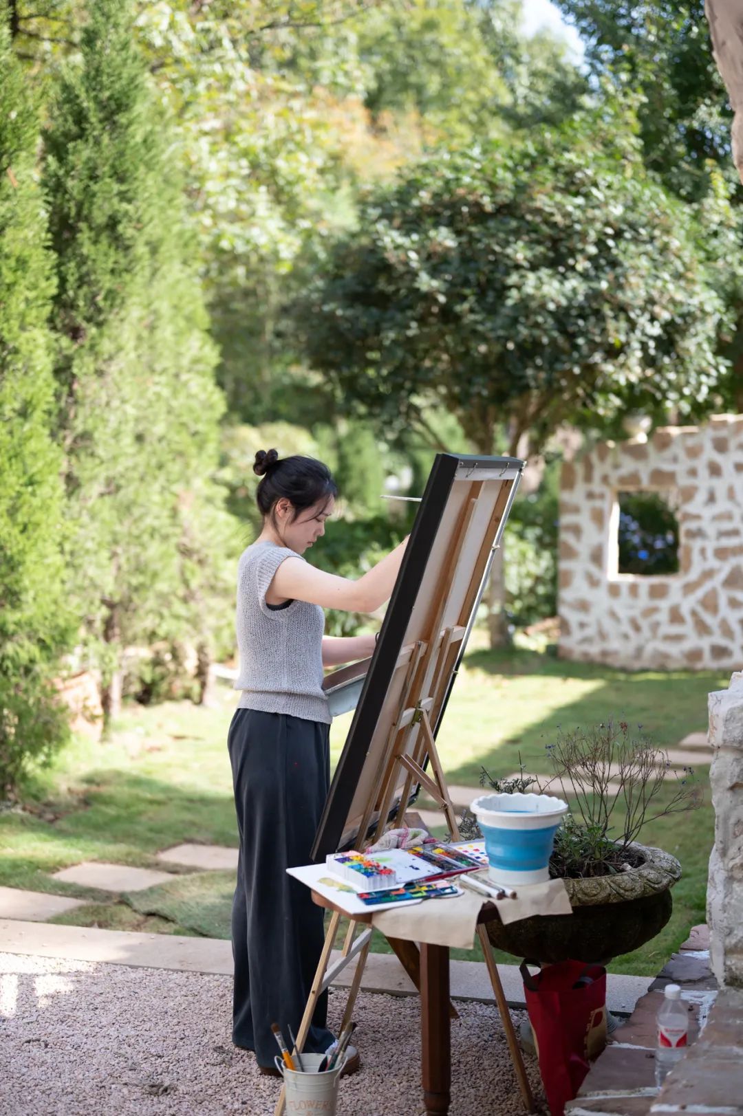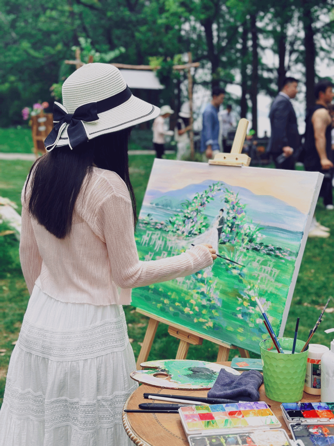 贺雪融通常会带画板、画架、颜料、画笔去现场,这些物品加起来有近10公斤重。她说:“新人收到画,一般都会夸‘好美啊’,然后对我说‘谢谢’。总体来说,这个工作还是很浪漫、很有意思的。”