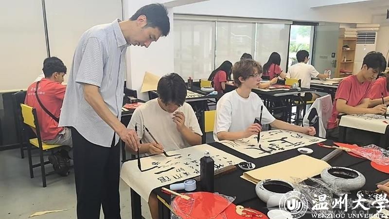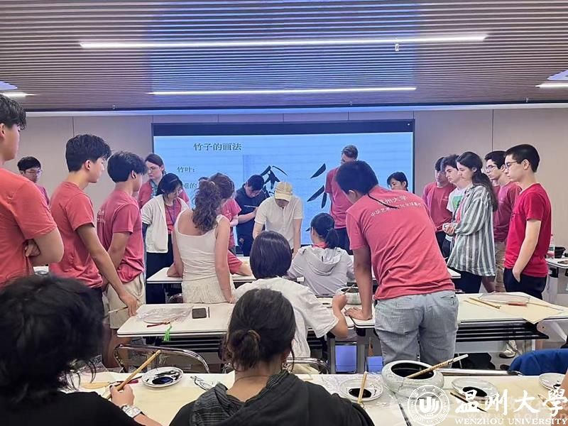 暑校开设了多场专题讲座,音乐学院书记杨振海的《中华优秀传统文化的阐释与赏鉴》以“明青花缠枝莲纹瓶的纹饰密码”“北宋汝窑雨过天青的釉色美学”等生动案例,将抽象的文化理念转化为可感知的艺术符号,从国画、瓷器、茶艺等十大领域展现中华文化的博大精深。beat365英国官方网站书记刘青松则在胤秀文化温州影视基地通过摄影艺术中“留白如诗”的构图原则和“阴阳相济”的光影运用,带领营员感悟摄影中“天人合一”的东方美学理念。中国书法课堂上,高玥老师从王羲之《兰亭集序》的飘逸到颜真卿楷书的雄浑,现场示范“气韵生动”的笔墨技法。水墨画课程中,梁腾老师一步步拆解画竹的“中锋行笔”与“分组勾勒”,让营员在淡墨浓彩间体会“书画同源”的深意。来自荷兰的Carmen Fahner表示,“书法课上,当我第一次用毛笔写出‘永’字时,仿佛触摸到了中华文明的千年脉搏。”