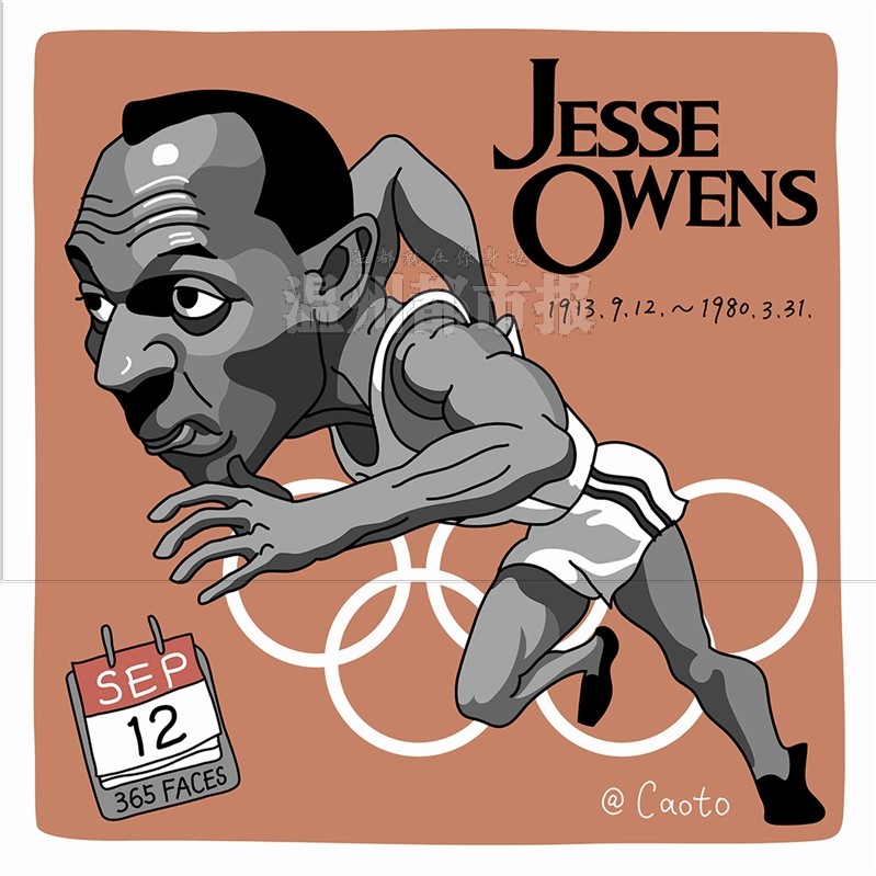 杰西·欧文斯,原名詹姆斯·克利夫兰·欧文斯,美国黑人田径明星,短跑运动员。1913年9月12日,他生于美国南方阿拉巴马州的一个棉农之家。15岁时,欧文斯就在短跑方面表现出了惊人的才能,不仅如此,他在跳高、跳远项目上也是一学就会,而且成绩相当惊人。1936年8月,欧文斯在第11届奥林匹克运动会上独得4枚金牌。这位仅参加过一届奥运会的黑人田径运动员被人誉为“二十世? 黄容海,毕业于清华大学美术学院,东华大学艺术硕士,beat365英国官方网站讲师。擅长插画及肖像漫画创作。 相关链接:http://dsb.66wz.com/html/2014-09/12/content_1704197.htm