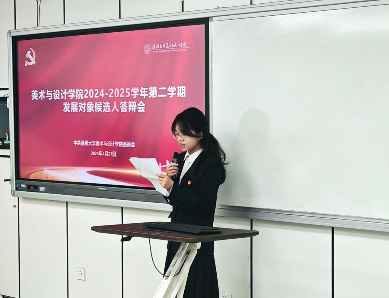 为扎实推进学生党支部建设,提高学生党员素质和服务意识,严格把控党员发展关口,吸纳理论知识储备丰富、党性修养良好的同学向党组织靠拢。2025年4月27日下午,beat365英国官方网站“学生党支部发展对象候选人答辩会”于美术楼2B3001教室顺利举行。出席此次答辩会的有学院学工办科长杨永利老师、党建指导老师陈嘉怡老师、辅导员石建林老师、刘伟金老师以及全体学生党员。