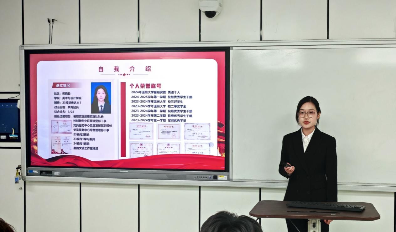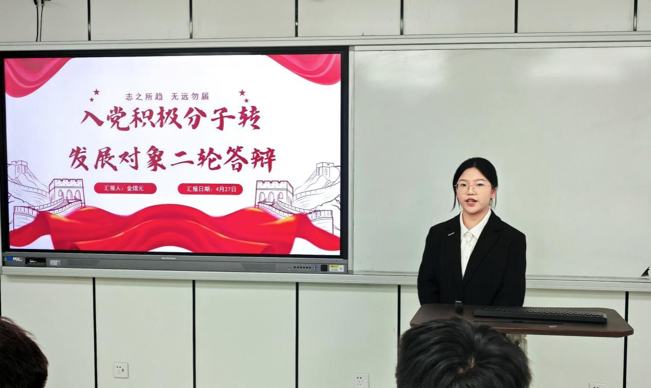 为扎实推进学生党支部建设,提高学生党员素质和服务意识,严格把控党员发展关口,吸纳理论知识储备丰富、党性修养良好的同学向党组织靠拢。2025年4月27日下午,beat365英国官方网站“学生党支部发展对象候选人答辩会”于美术楼2B3001教室顺利举行。出席此次答辩会的有学院学工办科长杨永利老师、党建指导老师陈嘉怡老师、辅导员石建林老师、刘伟金老师以及全体学生党员。会议开始,主持人叶欣雨同志宣布本次答辩会的议程和相关要求。本次答辩共有30位发展对象候选人。候选人依次通过PPT进行个人陈述,主要汇报入党动机、学习工作、志愿服务等方面情况以及自身存在的不足与未来展望等。评审通过对发展对象候选人的党章理论知识考核成绩、量化考核和现场答辩汇报等方面进行全方位考察。学院党建指导老师陈嘉怡对本次答辩会作了总结。陈老师希望各位学生党员时刻铭记自己的初心使命,秉持着“成熟一个,发展一个”的原则,认真对待每一个发展对象。并强调这不仅是对候选人负责,更是对党组织纯洁性和先进性的有力保障,确保为党输送德才兼备的新生力量。会后,集中观看《永远吹冲锋号》第三集《铁规矩硬杠杠》纪录片。陈嘉怡老师领学《beat365英国官方网站党员先锋引领“十要”》文件精神,深入解读了党员带头作用、骨干作用和桥梁作用的深刻内涵与重要意义。她指出,学生党员要敢于担当作为、勇于攻坚克难,积极践行“十要”准则,认真落实“五个带头”优良作风,以担当尽责的实际行动践行初心使命,争做温大先锋。本次拟发展对象答辩会,是新时代党的组织路线在基层党组织中的生动实践。这一举措为党员发展工作提供了规范化、制度化的流程。会后的深入贯彻中央八项规定精神学习教育与“党员先锋引领十要”准则的学习更是强化了学生党员的党性修养。希望各位学生党员能坚定信念,化正确思想为实际行动;同时希望各位拟发展对象能始终以一名共产党员的标准严格要求自己,积极向党组织靠拢,争取早日加入中国共产党!图文:沈吟珊 周心妍初审:何唐蔚复审:陈嘉怡终审:刘青松 叶如芳