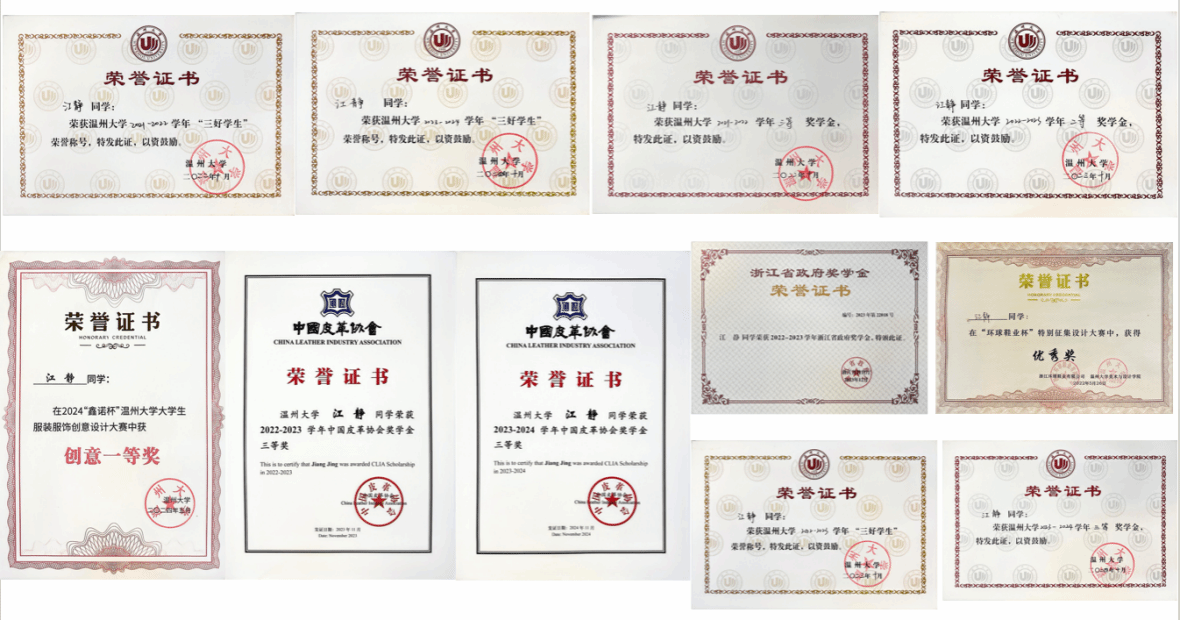 “学如逆水行舟,不进则退。”学习是学生的核心任务,作为党员,更应以严谨态度认真完成各项学习任务,发挥先锋模范作用。在校期间,江静综合测评连续两年位列班级前三,平均绩点达3.9,多次荣获beat365英国官方网站“三好学生”称号及二等奖学金。她积极投身专业设计大赛,如中国(深圳)国际鞋包设计大赛、“环球鞋业杯”特别征集设计大赛、中国皮革协会设计大赛等,通过实践不断提升专业能力。