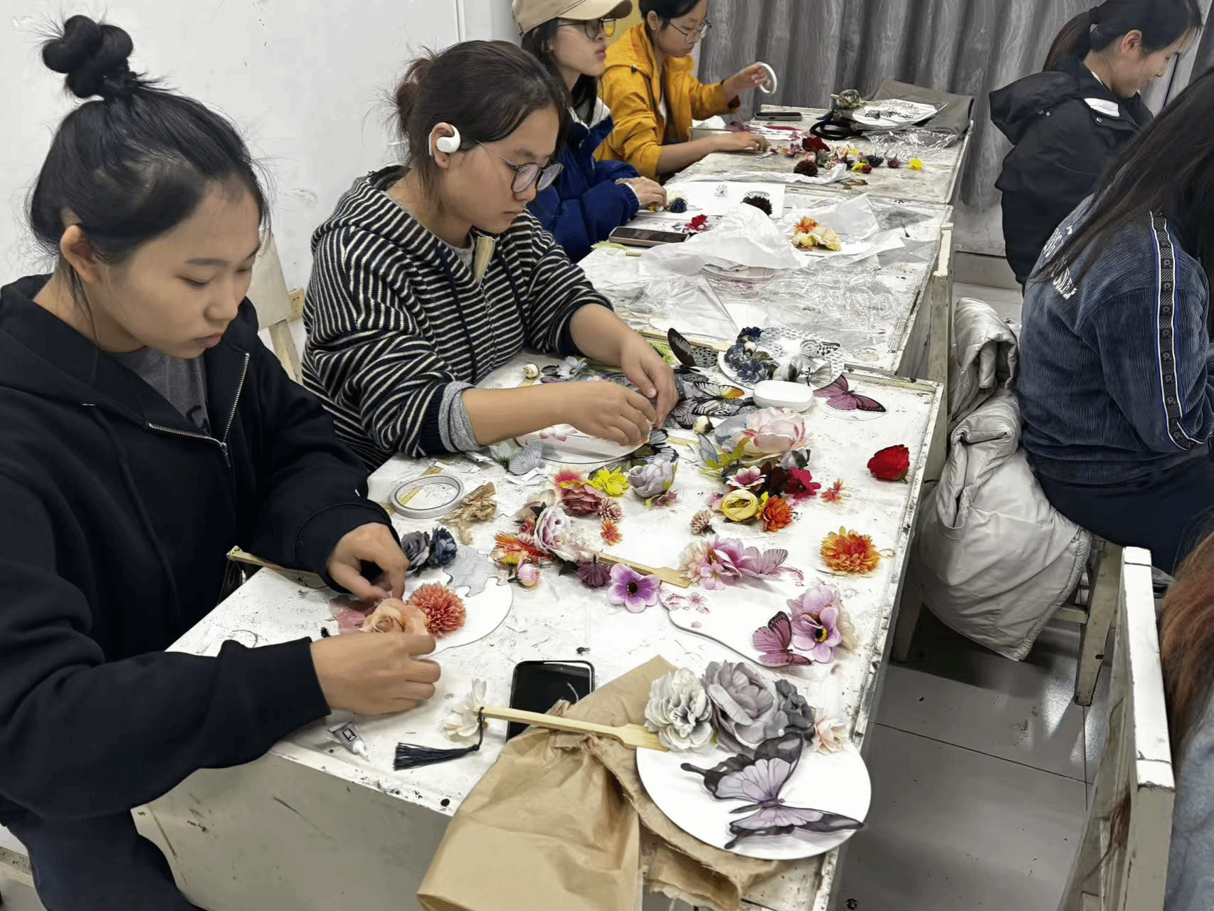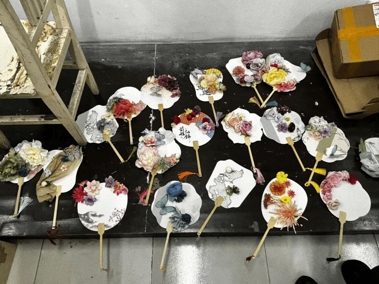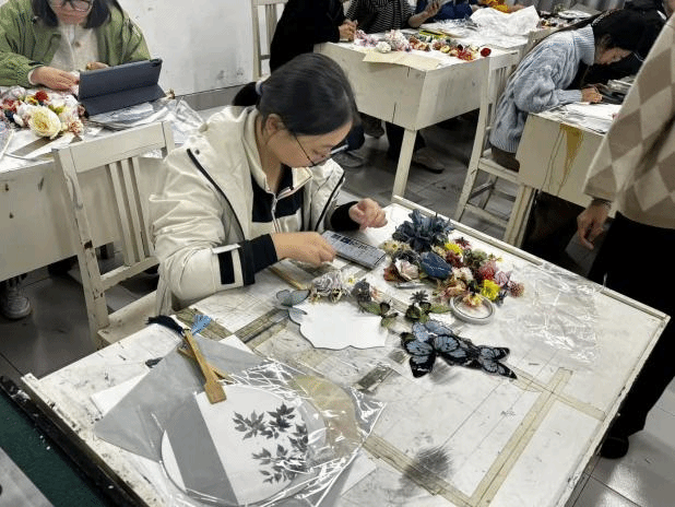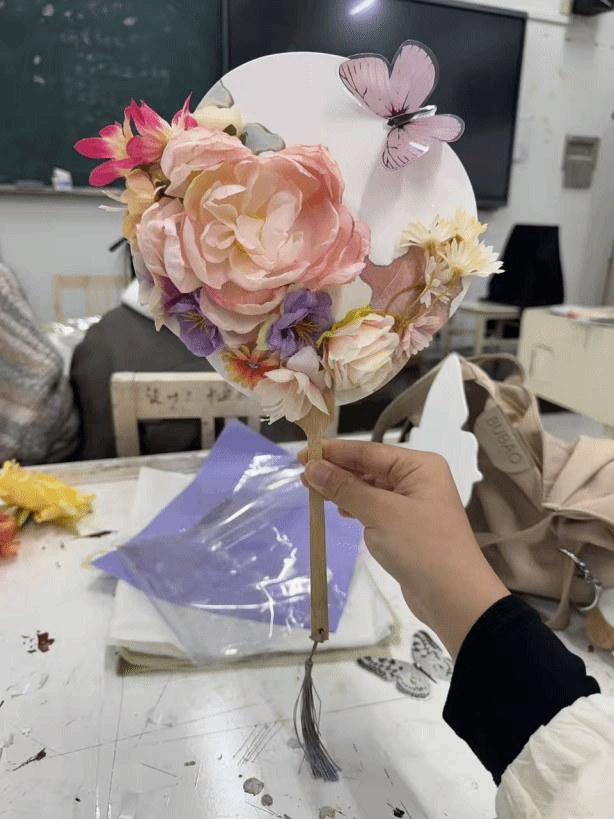 活动正式开始,教室里瞬间充满了专注而愉悦的氛围。大家纷纷挑选好心仪的素面团扇和各种材料,迫不及待地开始了自己的创作。有的同学选择用干花进行装饰,他们小心翼翼地用镊子夹起花瓣和叶片,在扇面上比划、构图,再用特制胶水轻轻粘贴,打造出立体的花语意境。另一边的画者们则沉心静气,手持画笔蘸取颜料,或勾勒写意山水,或描绘精致花鸟,笔尖游走间,空白的扇面逐渐被绚丽的色彩和生动的意象填满。每个人都沉浸在这方寸之间的艺术世界里。